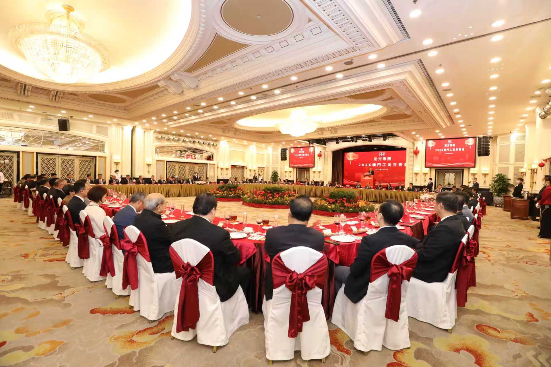 【即時新聞】南光集團於今晚在萬豪軒舉辦2026年澳門工商界春茗。南光集團董事長傅建國出席活動並致辭,集團領導班子及有關職能部室、二級公司負責人參加活動,與澳門工商界人士深入交流,場面熱烈。
