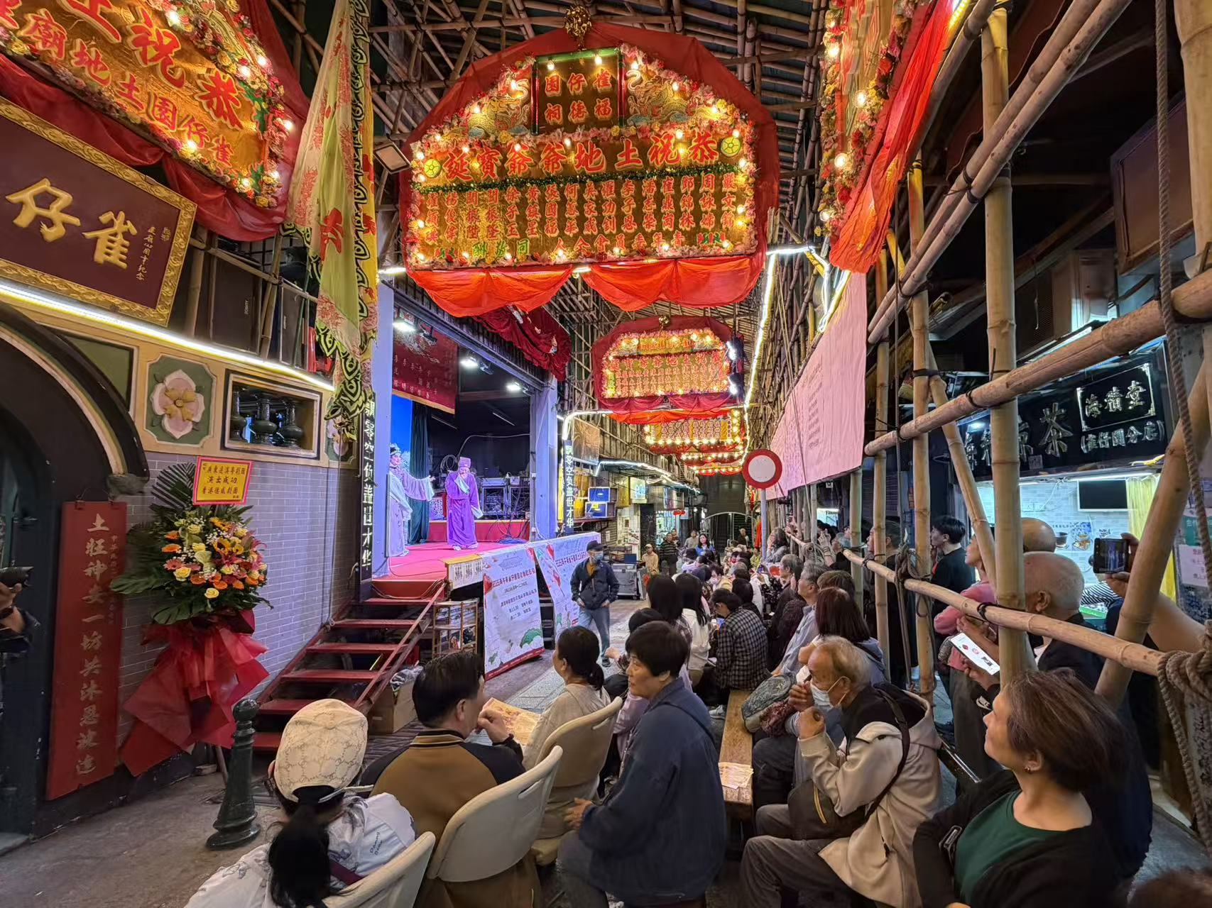 今晚七時半上演首場劇目《紫釵記》,現場座無虛席,氣氛熱鬧,不少市民到場感受傳統節慶和演出文化。雀仔園福德祠土地廟值理會理事長陳智威表示,首場劇目《紫釵記》由會內投票結合街坊意見選出,在澳門,神功戲與祭祀活動相融,此次活動面向街坊及長者群體,既為鄰里搭建互動平台,也給長者提供了夜間活動的機會,同時期望令更多年輕市民加深對土地信俗的認識,實現文化傳承。