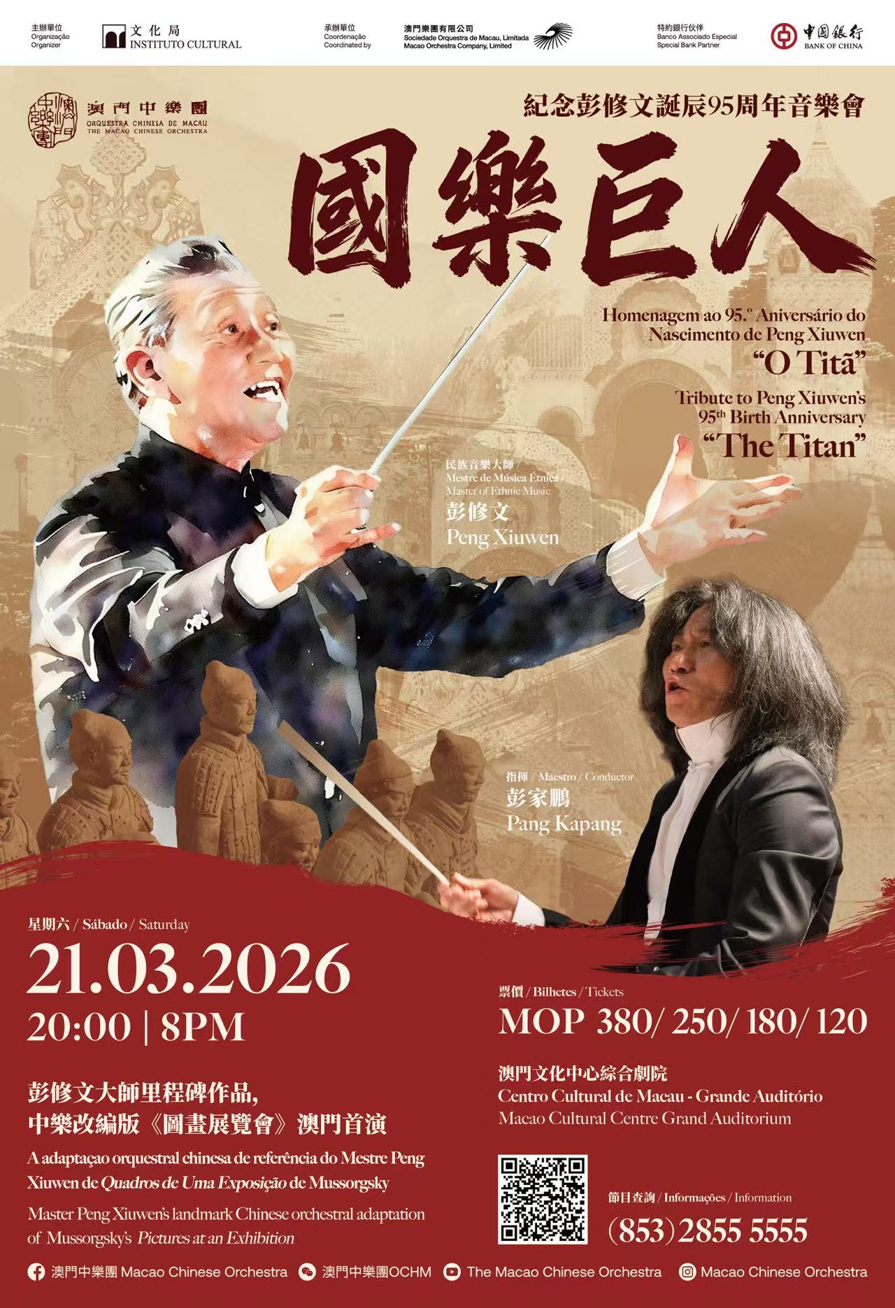 【即時新聞】由文化局主辦、澳門樂團有限公司承辦、澳門中銀支持的《國樂巨人》將於3月21日(本週六)晚上8時假澳門文化中心綜合劇院上演,藉此紀念彭修文誕辰95週年。中樂團將在指揮家彭家鵬的帶領下,演奏中國民族音樂一代宗師彭修文的系列作品,以不朽音樂篇章向大師致敬。音樂會《國樂巨人》為澳門中樂團2025-26樂季節目之一。