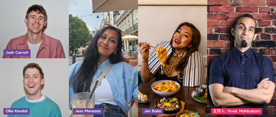 專題討論3:“美食內容創作實踐:解鎖百萬流量”,將探討美食創作者的成功案例,剖析其背後的策略部署、真實性展現及創意互動方式。參與討論的嘉賓包括YouTube頻道“Korean Englishman”及“Jolly”創作者Josh Carrott和Ollie Kendal,合共訂閱量逾1,100萬;在澳門長大的Instagram內容創作者Jess Menezes,@thatfoodiejess追蹤數量約44萬;美食部落格Indulgent Eats創辦人及香港Barkada餐廳聯合創辦人Jen Balisi,@indulgenteats追蹤數量逾36萬。