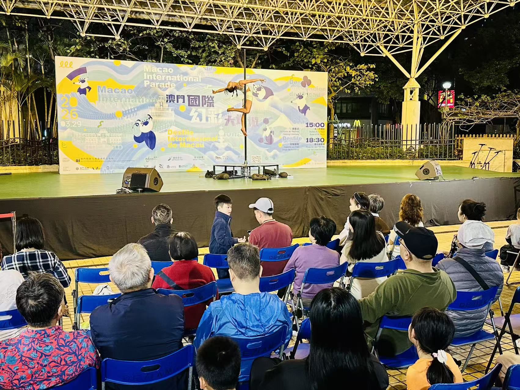 今晚的演出主打多元藝術融合,亮點紛呈。晚上7時半至8時,澳門YOGAFLY空中瑜伽舞蹈協會率先亮相,表演者將柔韌的肢體語言與高難度的懸吊技巧完美交融,利用鋼管、吊環等道具完成各種攀爬、伸展、翻滾與旋轉動作,於半空之中演繹出輕盈優雅的視覺詩篇,讓觀眾沉浸式領略運動力學與藝術美感結合的魅力。