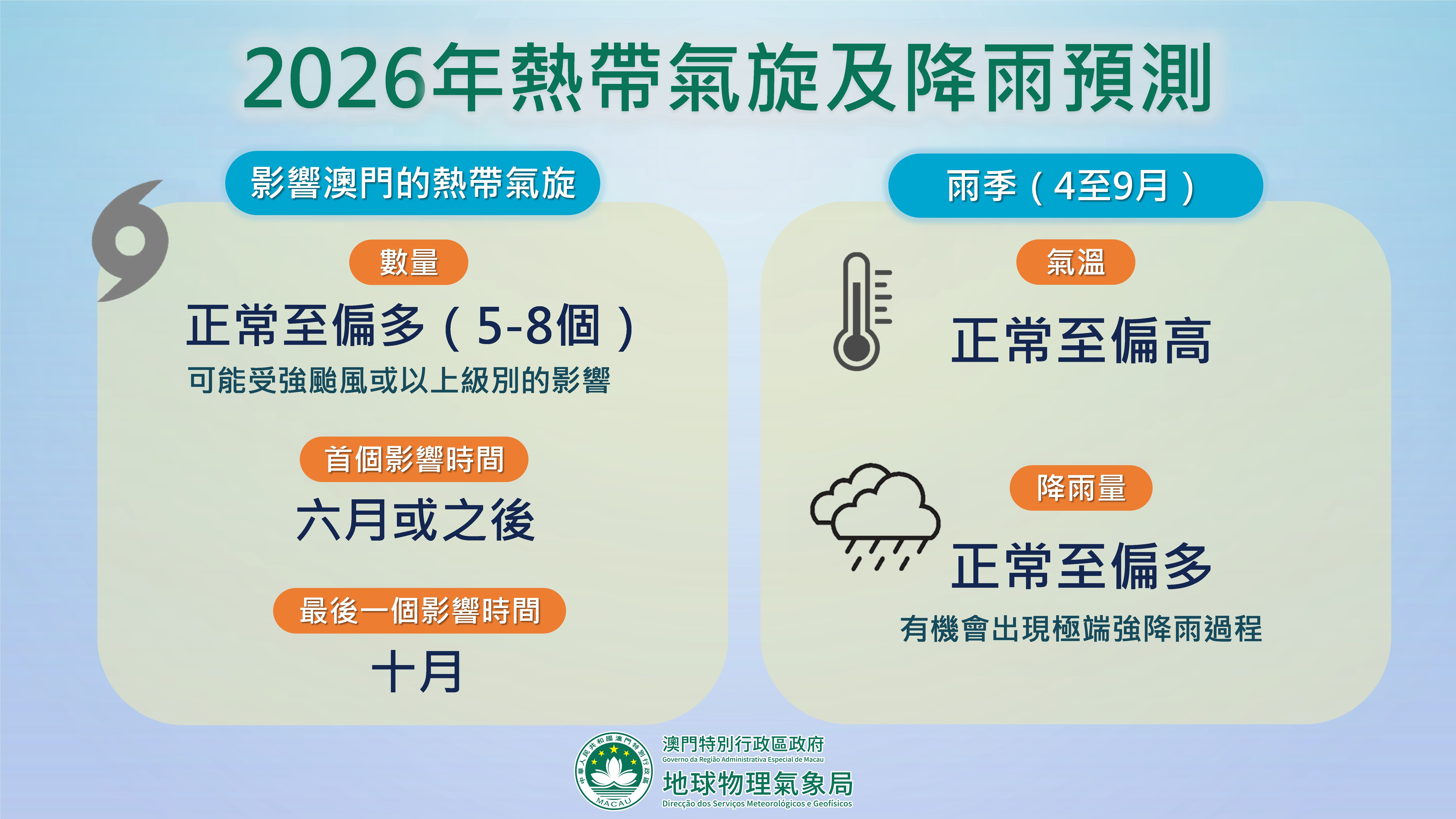 【即時新聞】根據最新的海洋觀測及預報資料顯示,「拉尼娜」狀態正逐漸緩和,春季將有機會回復至「ENSO中性」狀態,並在夏季進入「厄爾尼諾」狀態。地球物理氣象局預測今年(2026年)約有5至8個熱帶氣旋影響澳門,數量正常至偏多,且可能受強颱風或以上級別影響,預料風季將在6月或之後開始,10月結束。同時,預測今年雨季(4至9月)的平均氣溫屬正常至偏高,累積降雨量屬正常至偏多,並可能出現極端強降雨過程。