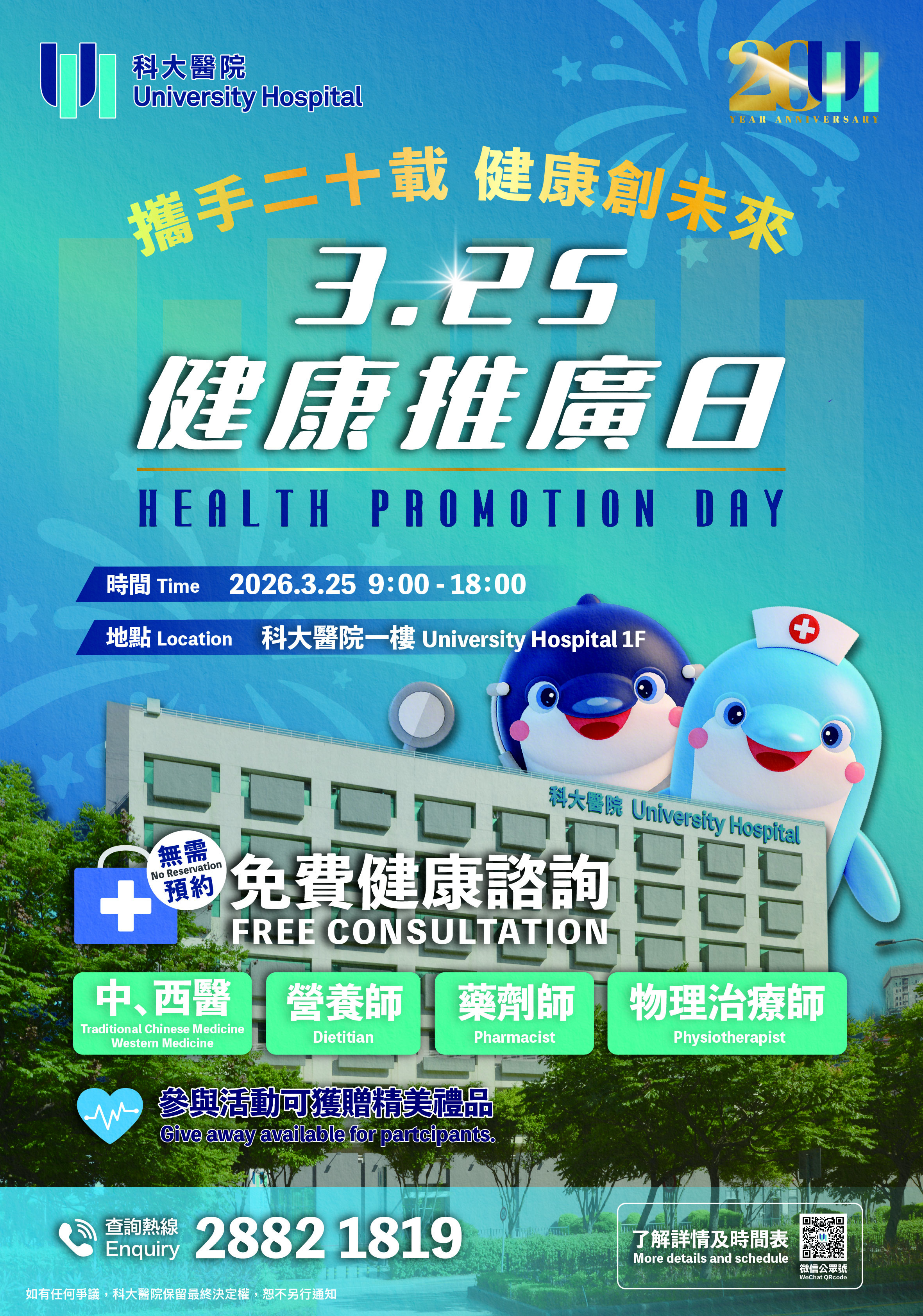 【即時新聞】為慶祝科大醫院成立20周年,科大醫院將於本週三(25日)上午9時至下午6時舉辦健康推廣日,由多名經驗豐富的中、西醫生、營養師、藥劑師及物理治療師等專業人員,於現場為市民免費提供個人健康諮詢,推廣健康的重要性。