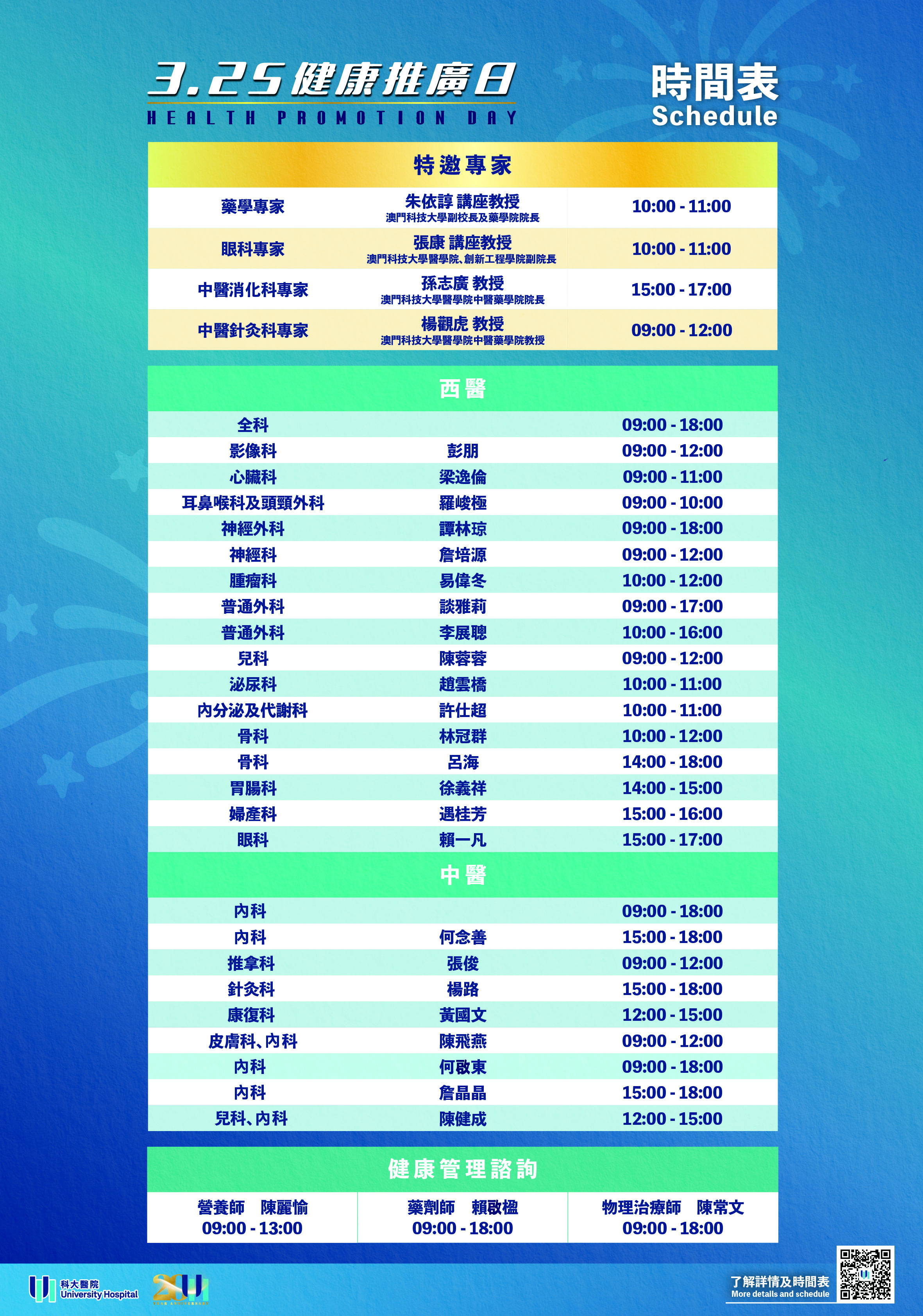 屆時科大醫院一樓國際健康管理中心將化身為“健康推廣站”,專科西醫涵蓋眼科、心臟科、內分泌及代謝科、胃腸科、普通外科、神經科、神經外科、婦產科、腫瘤科、骨科、耳鼻喉科及頭頸外科、兒科、泌尿科等,多名資深中醫也會在場,解答市民的個人健康疑問。