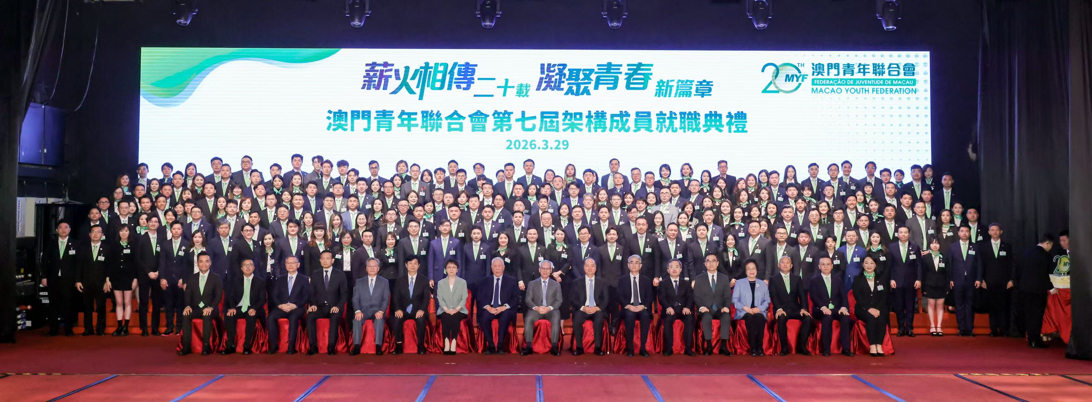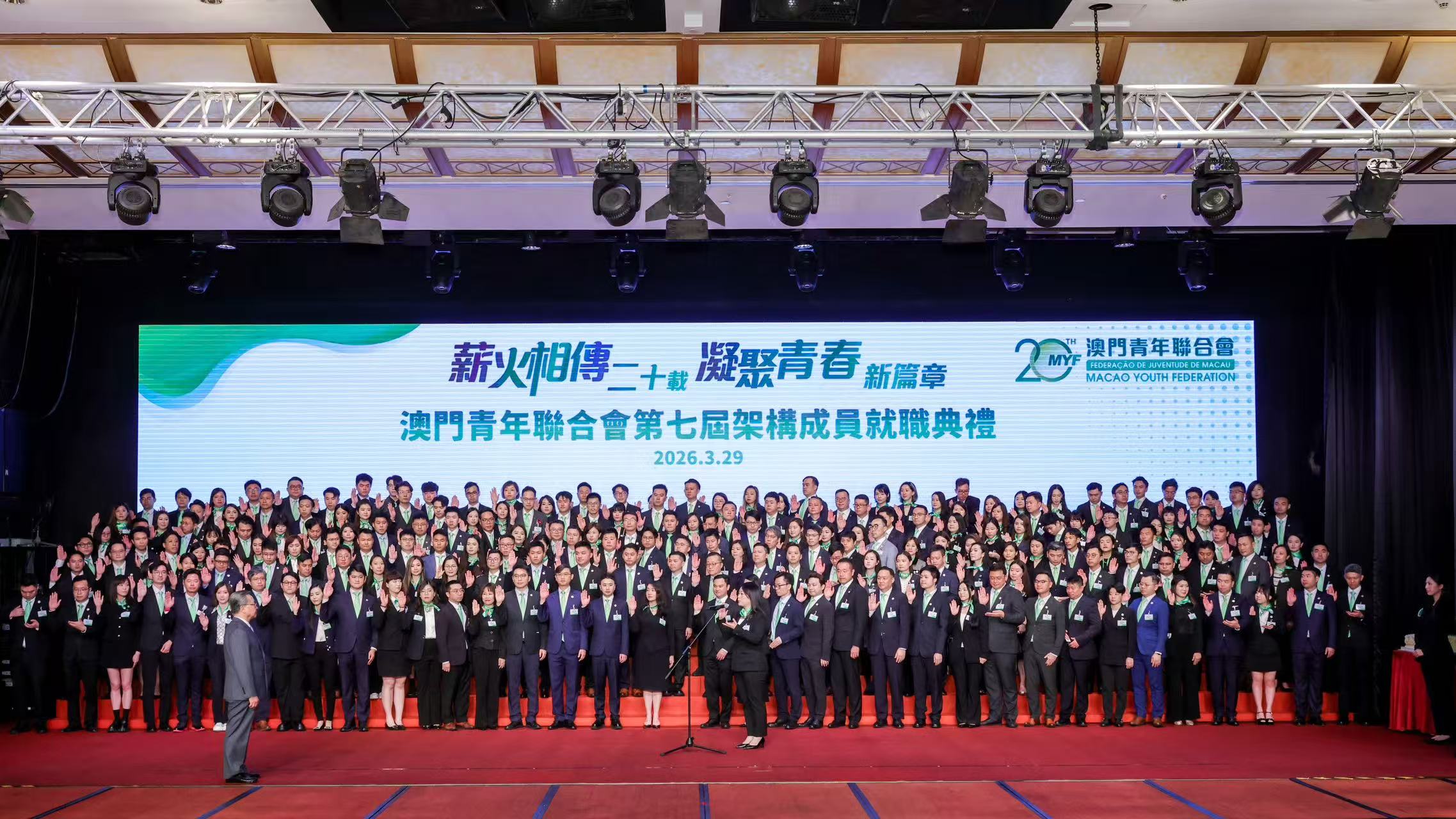 【即時新聞】澳門青年聯合會舉行成立二十週年慶典暨第七屆架構成員就職典禮,行政長官岑浩輝、全國政協副主席何厚鏵、中聯辦主任鄭新聰、外交公署特派員卞立新、立法會主席張永春 等嘉賓出席見證。