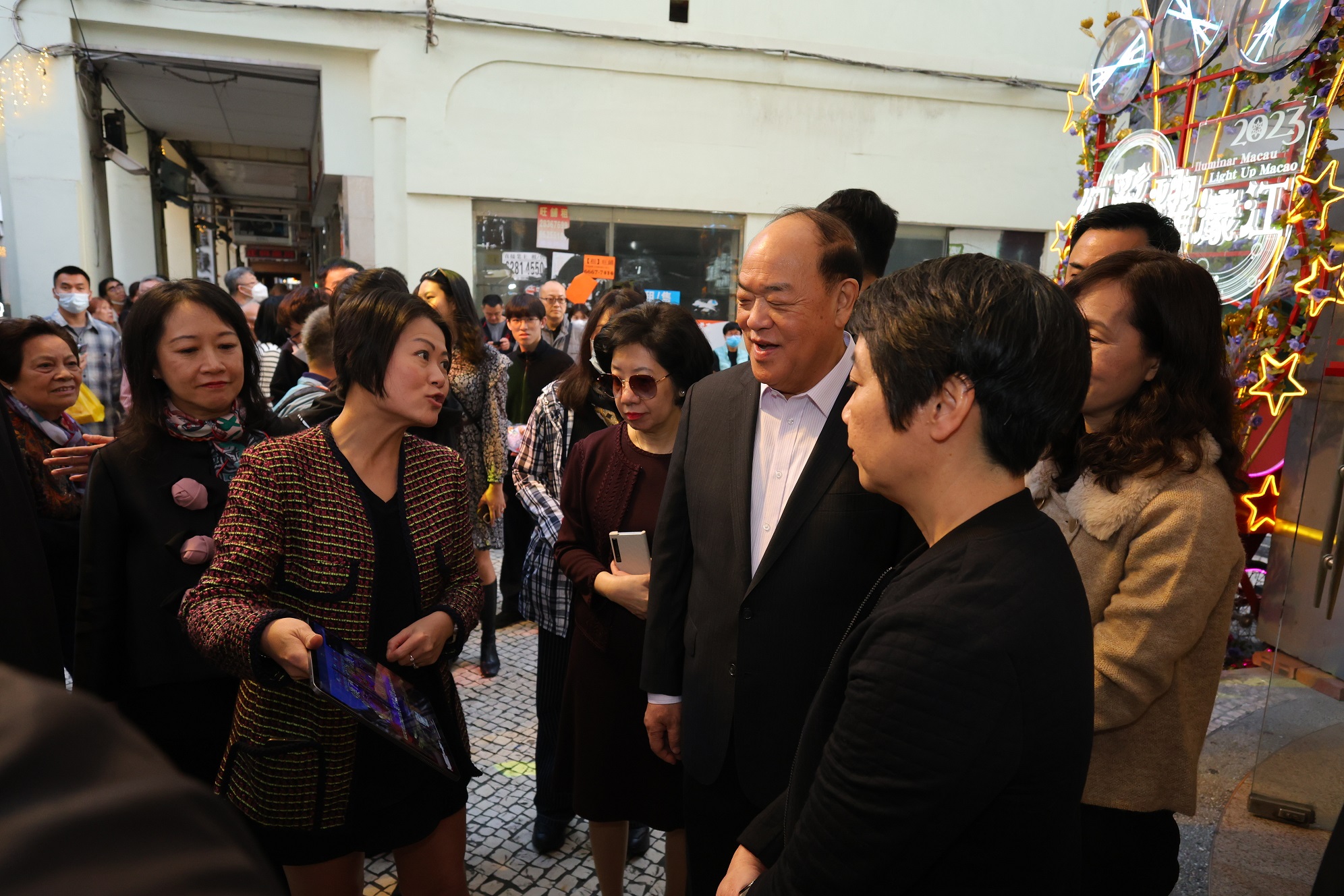 其後,行政長官前往福隆新街步行區,觀賞由永利澳門帶來的新春裝飾、文藝表演及文創市集,體驗文化創意與古街老巷和舊建築的結合,同時瞭解金碧文娛中心的現況,欣賞了澳娛綜合呈獻的“新馬路閃起來” 幻彩燈光表演。