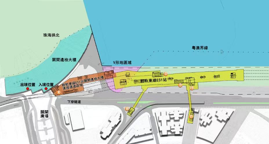 澳門輕軌東線ES1站原位於關閘邊檢大樓東南側,連接通道設置在關閘廣場現有的旅遊巴停泊區,通過地下通道及天橋,與關閘邊檢大樓直接相連,實現關閘邊檢大樓與輕軌東線以至現時氹仔線的無縫銜接;通過打造片區綜合交通樞紐,實現客流無縫接駁,加強出行的便利性。