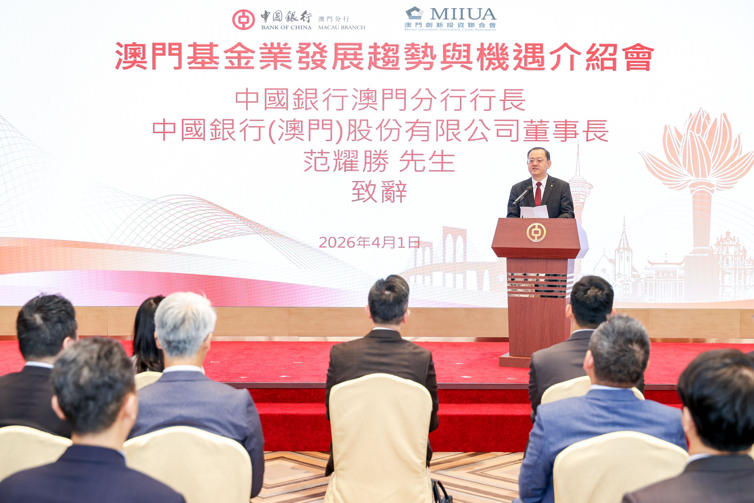 范耀勝致辭表示,當前澳門正在加快建設世界旅遊休閒中心、中國與葡語(西語)國家商貿合作服務平台,積極推動「1+4」產業多元布局,深度融入粵港澳大灣區建設。特區政府去年頒佈了澳門《投資基金法》,並計劃在今年設立政府引導基金,期望以政府資本為牽引,撬動社會資本參與,吸引優質企業、人才集聚澳門,培育新興產業,支持產業轉型升級,推動澳門經濟適度多元發展。澳門中銀作為根植澳門七十六年的主流銀行、澳門元發鈔代理行、銀行公會主席行,將以本次活動為契機,積極發揮中銀集團商投行一體化聯動優勢,構建全方位、多層次金融服務體系,做好「融智、融資、融商」服務,為澳門基金業發展和政府引導基金落地貢獻更大的金融力量。