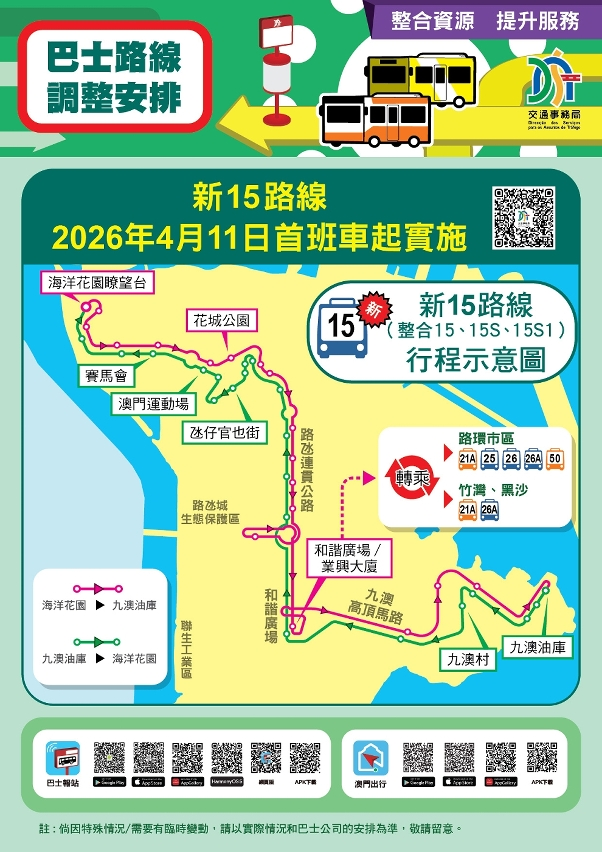 【即時新聞】為優化公共資源配置,交通事務局持續透過數據分析客流,並與兩間巴士公司協調,推動路線重組與站點優化。4月11日起將實施新15路線的巴士服務,並調整52路線的行程,透過整合資源、加密班次、擴大覆蓋,為市民提供更便捷的巴士服務。
