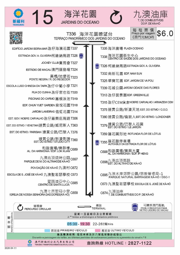 4月11日起,由現時15、15S及15S1路線合併的新15路線將以往返海洋花園及九澳村的路線運作,班次頻率將加密到22至26分鐘(詳情可參閱附圖1、2及3)。當中,將新增往來九澳高頂馬路及九澳油庫的行程,同時,前往路環市區、竹灣、黑沙等區域的乘客,則可透過轉乘其他路線繼續行程(詳情可參閱附圖4)。