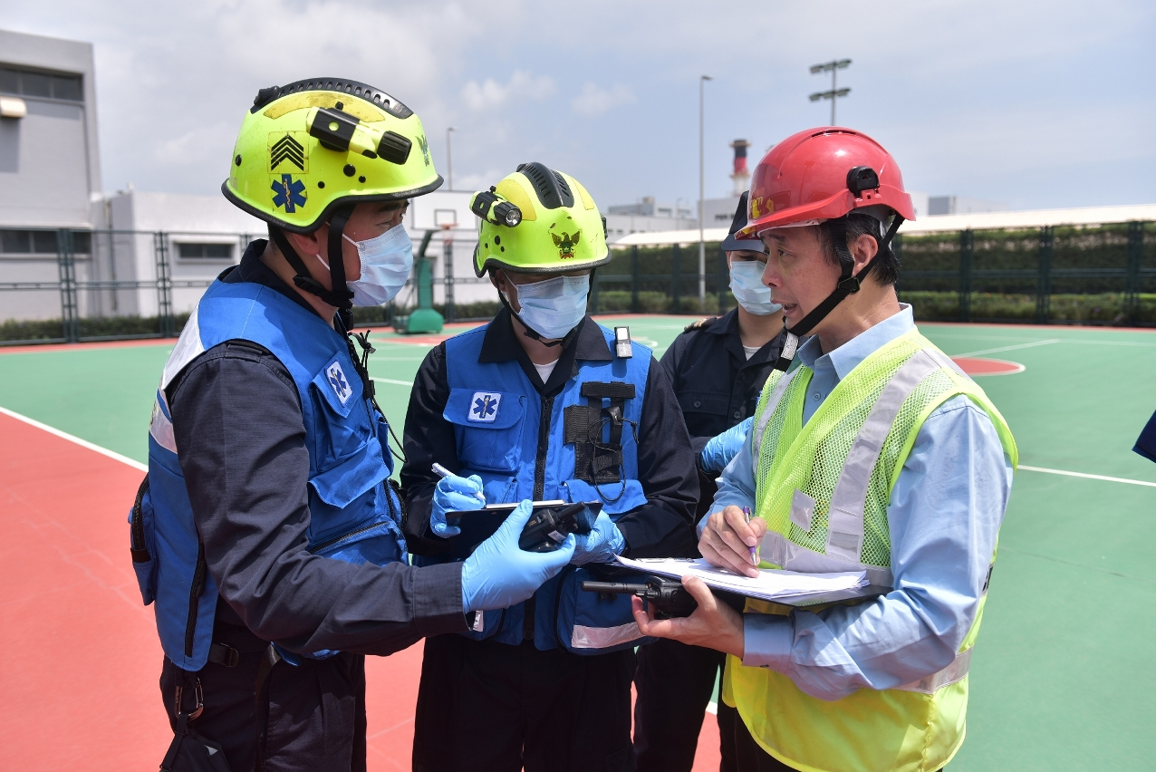 消防局接報後,隨即派遣6輛緊急車輛及28名人員趕赴現場,按照既定行動預案展開滅火救援及疏散工作。同時,救護員在疏散集合點清點人數,並對一名疏散期間受傷的員工進行護理後模擬送院。