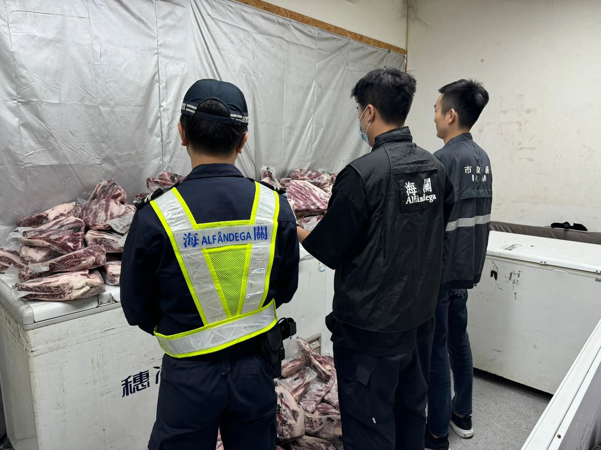 【即時新聞】海關人員日前在關閘一帶發現一個懷疑“水客”活動散貨點,即時對有關單位採取行動,現場查獲約1,300公斤冷凍牛排,市值約20萬澳門元,1人涉嫌違法被查。