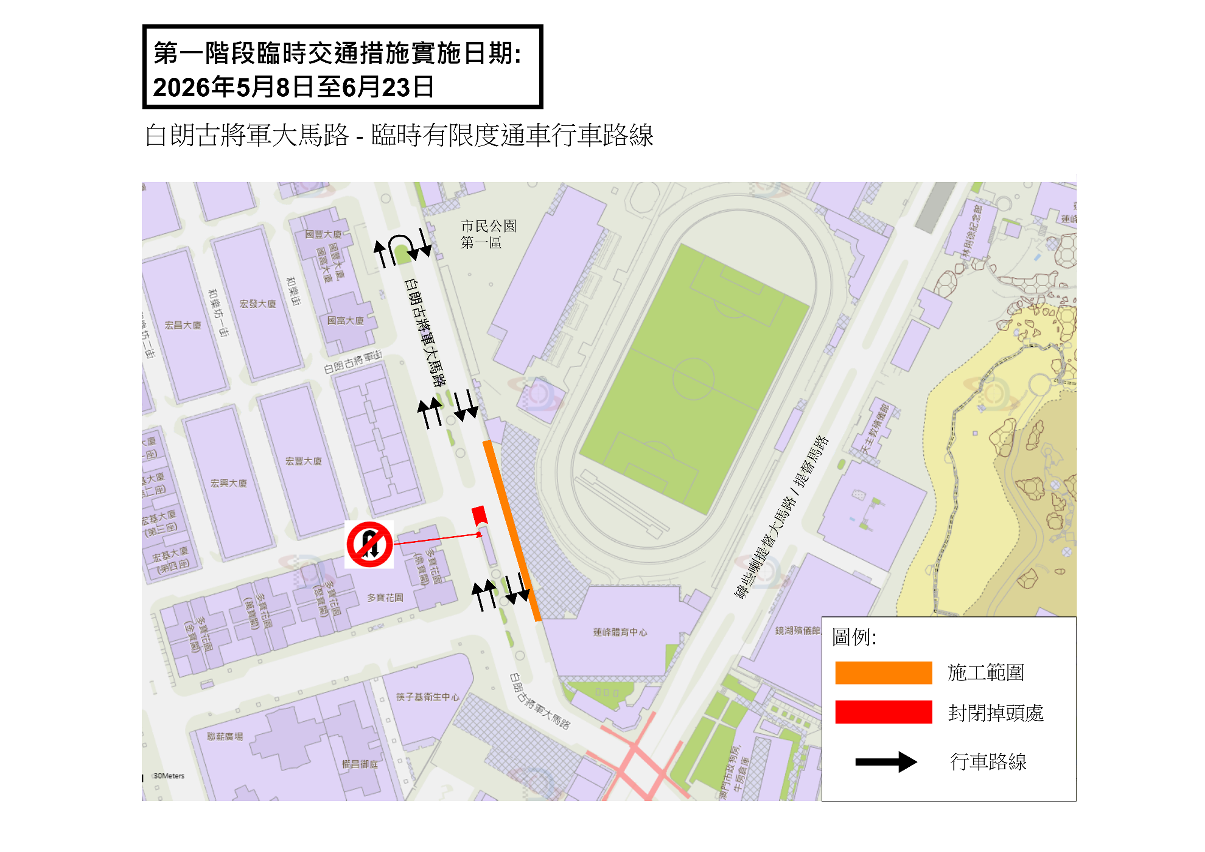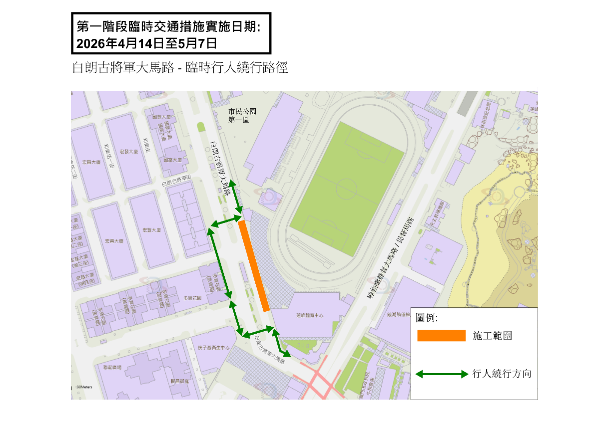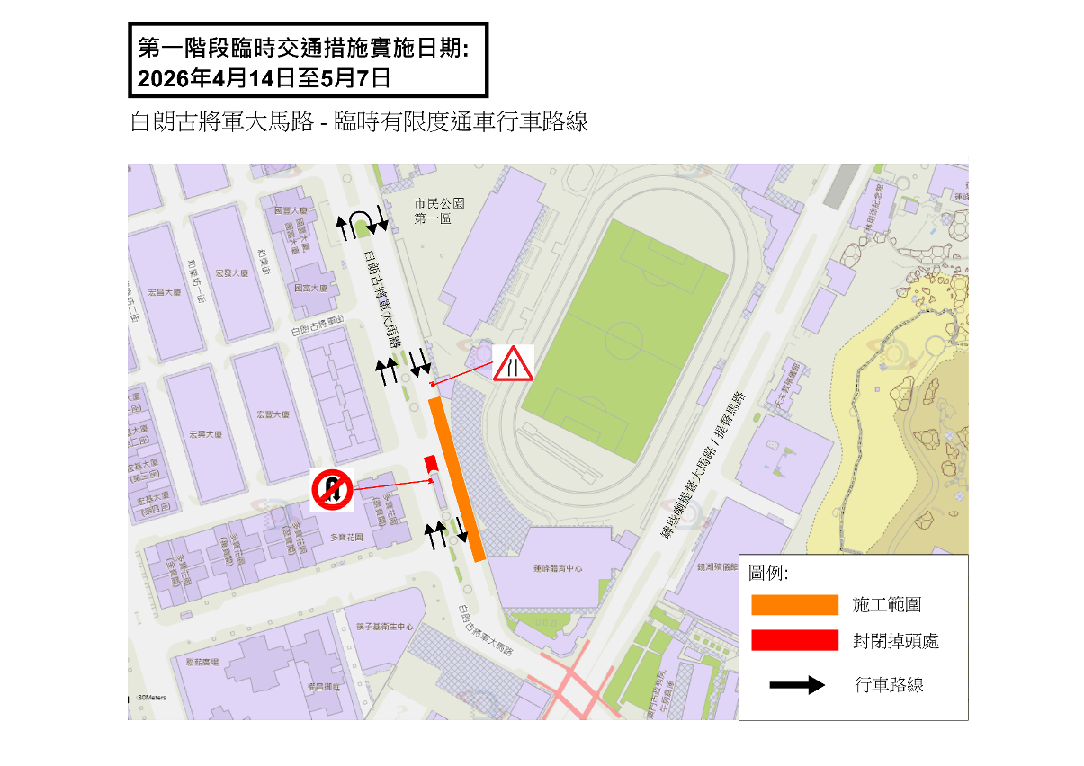 白朗古將軍大馬路方面,首階段施工由4月14日至5月7日,期間近蓮峰體育中心一段行人路臨時封閉並建造有蓋行人通道,行人需以斑馬線繞行;同時,對開一段行車線實施有限度通車,掉頭處將臨時封閉。第二階段則由5月8日至6月23日進行,屆時受影響的行人路將完成建造並恢復通行,行車線亦恢復雙線行車,惟相關掉頭處維持臨時封閉。