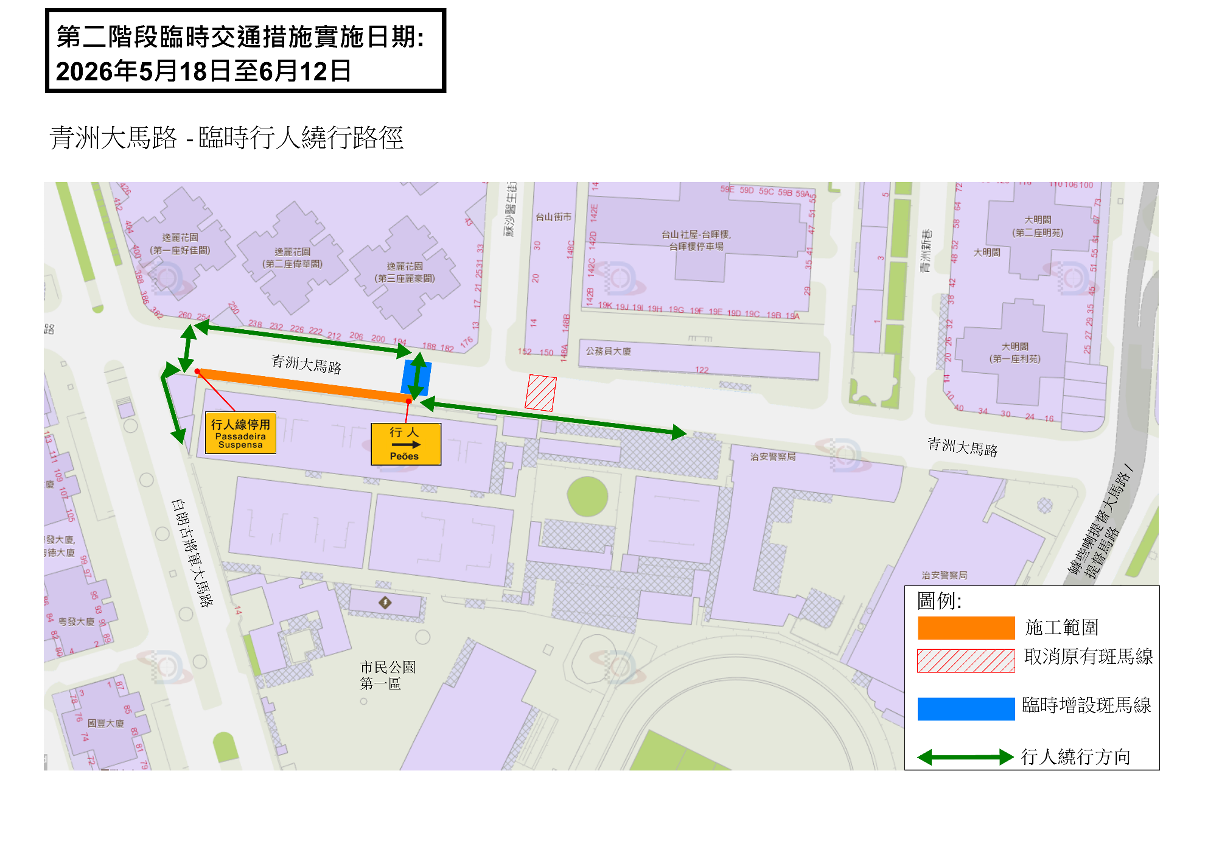 其中,青洲大馬路將於4月14日至6月12日分兩階段施工,屆時將遷移一處斑馬線,施工期間行人需配合新設斑馬線繞行。