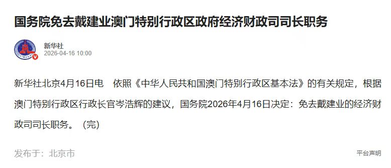 【即時新聞】根據新華社消息,依照《中華人民共和國澳門特別行政區基本法》的有關規定,根據澳門特別行政區行政長官岑浩輝的建議,國務院2026年4月16日決定:免去戴建業的經濟財政司司長職務。