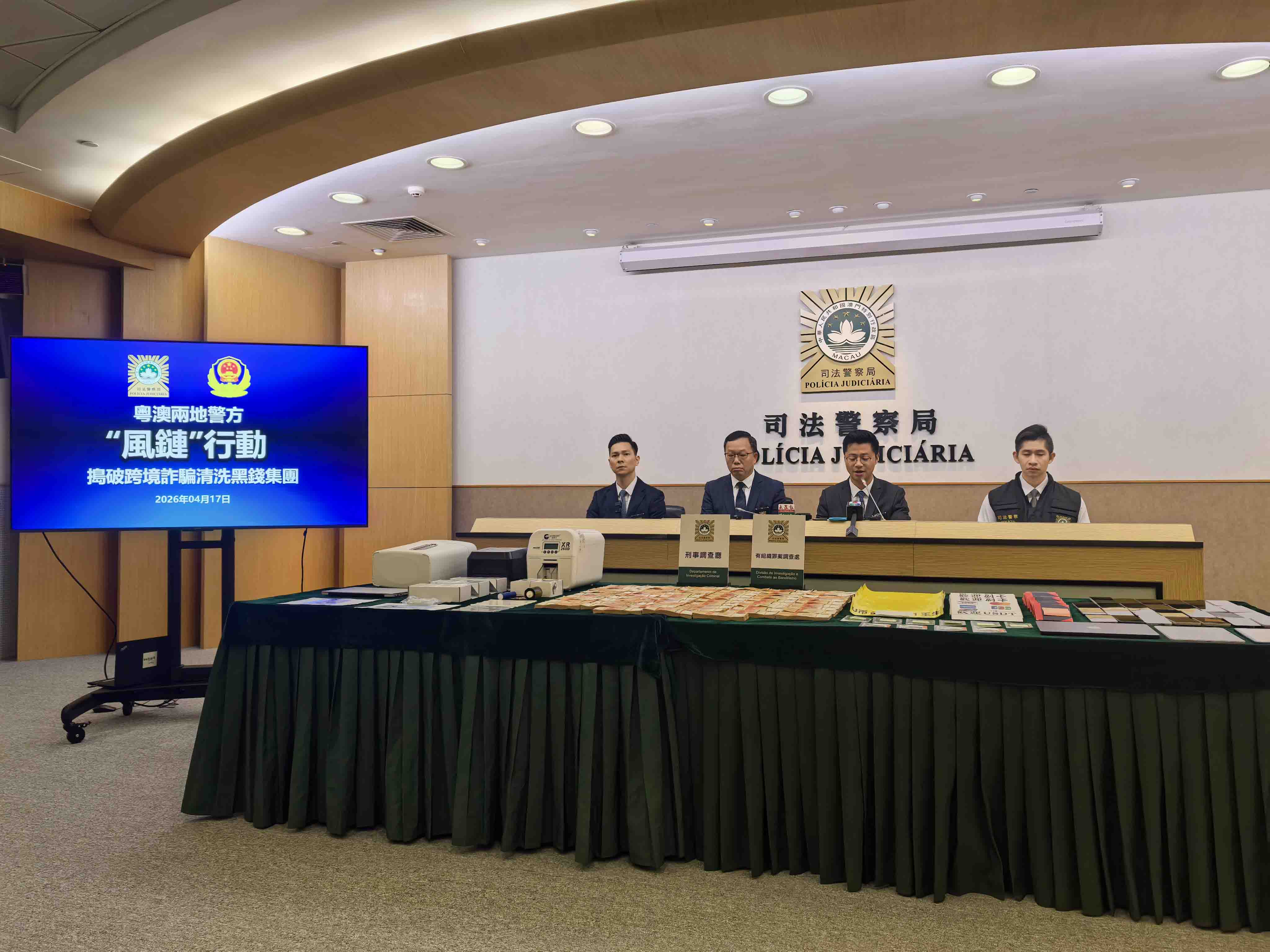 司警局與廣東省公安機關昨日(16日)展開代號「風鏈」的聯合打擊行動,成功瓦解一個橫跨澳門、珠海及廣西的跨境詐騙及清洗黑錢犯罪集團。行動中,兩地警方共拘捕65人,包括3名主腦,並扣押約570萬港元。初步調查顯示,該集團自去年1月至今,涉案清洗黑錢金額至少達4,560萬元人民幣,涉及內地八省市數百宗電信詐騙案件。