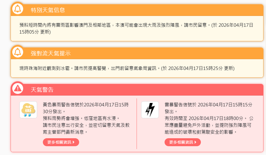【即時新聞】黃色暴雨警告信號於2026年04月17日15時30分發出。預料雨勢將會增強。低窪地區有水浸。