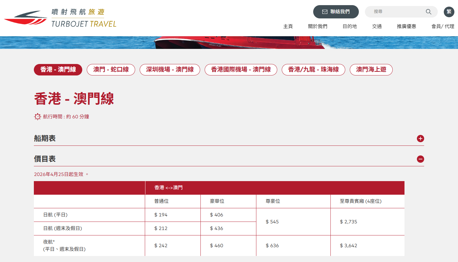 金光飛航表示,2026年4月25日起開航航班,船票價格將進行調整。 標準艙,日航 (平日) 港幣192;日航 (假日)港幣209 ;夜航 港幣242; 頭等艙:維持現有價格。