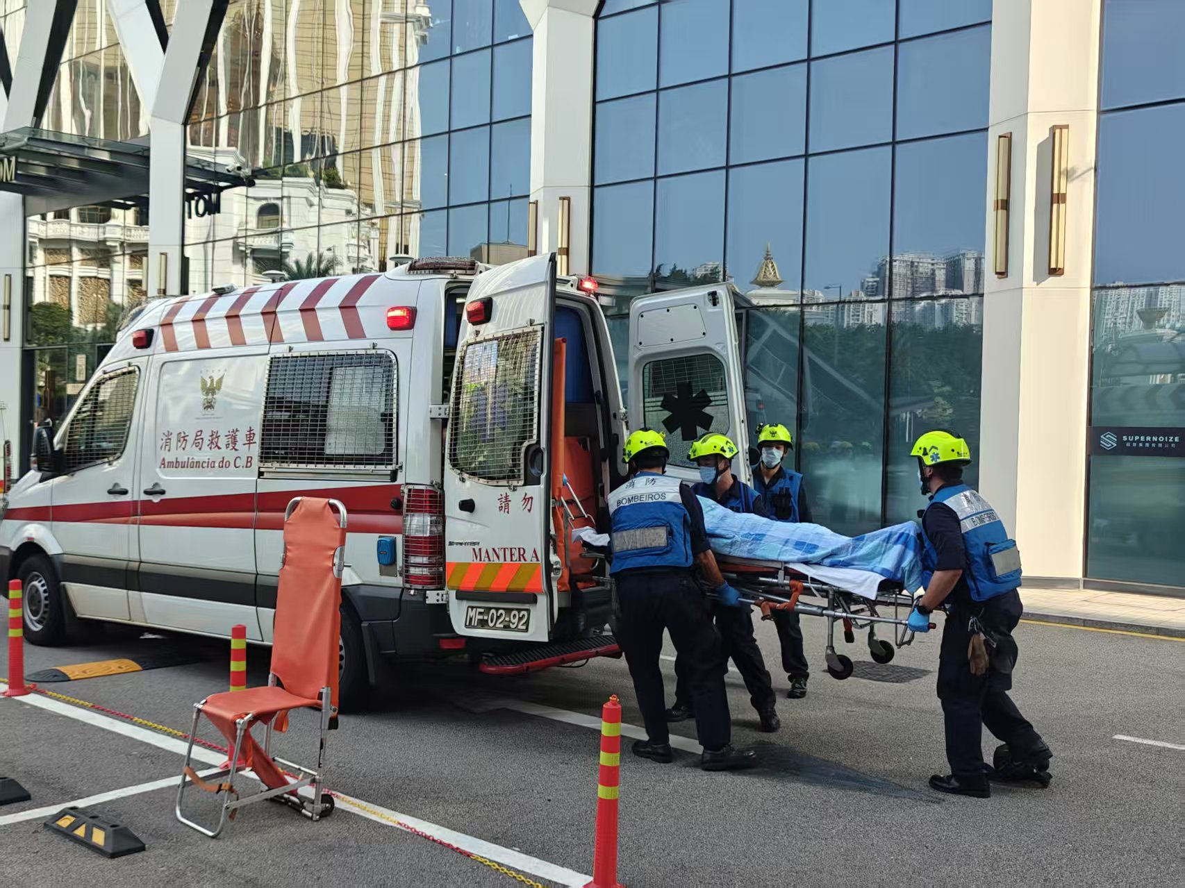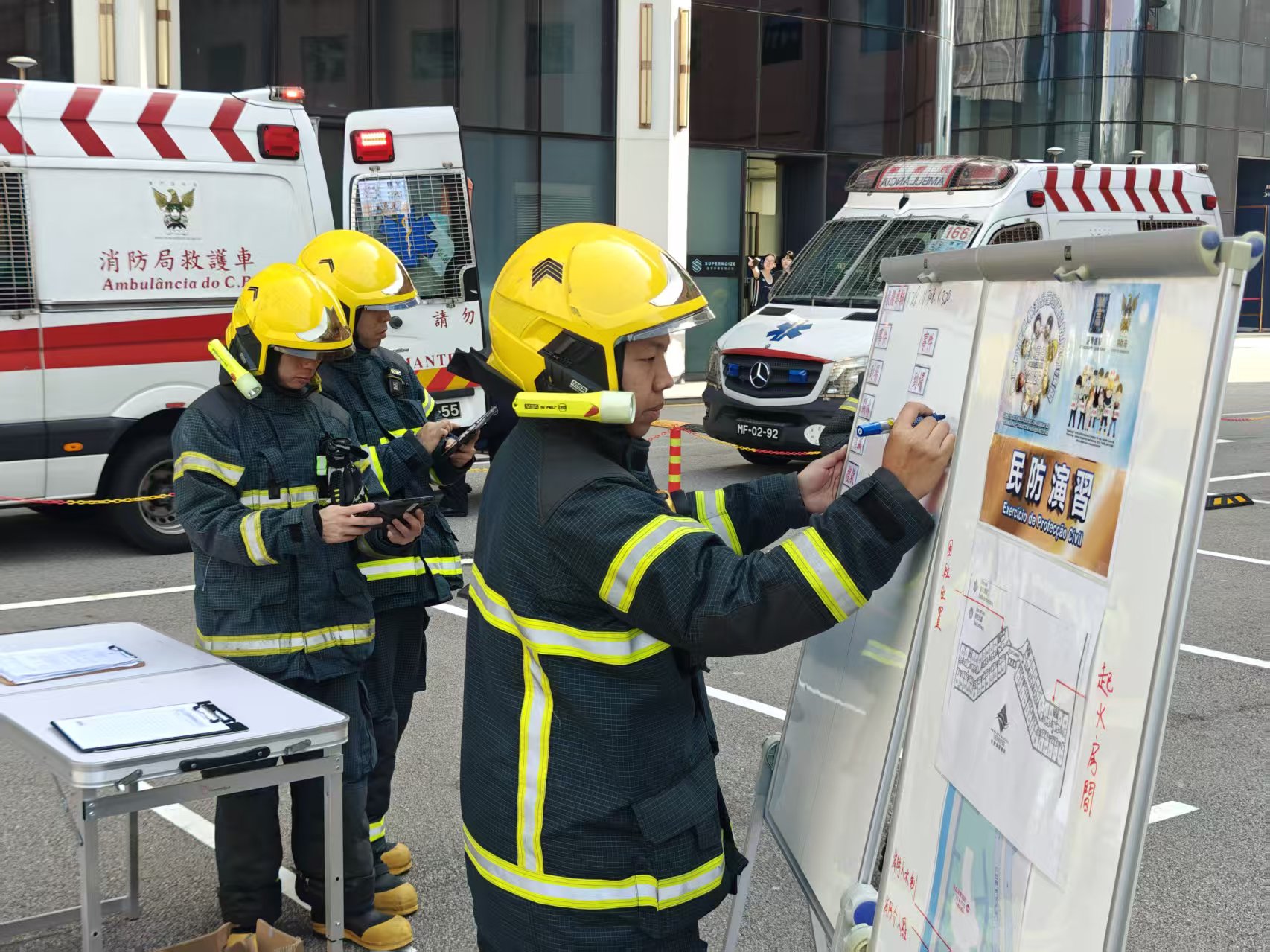 【即時新闻】「水晶魚2026」民防演習中,模擬8號風球懸掛期間,位於氹仔的一個酒店房間的雪櫃因機件故障冒煙,而引發火警及停電事故。演習過程中,分別執行撲滅火災、救出被困升降機住客、以及協助住客疏散等各項演練工作。