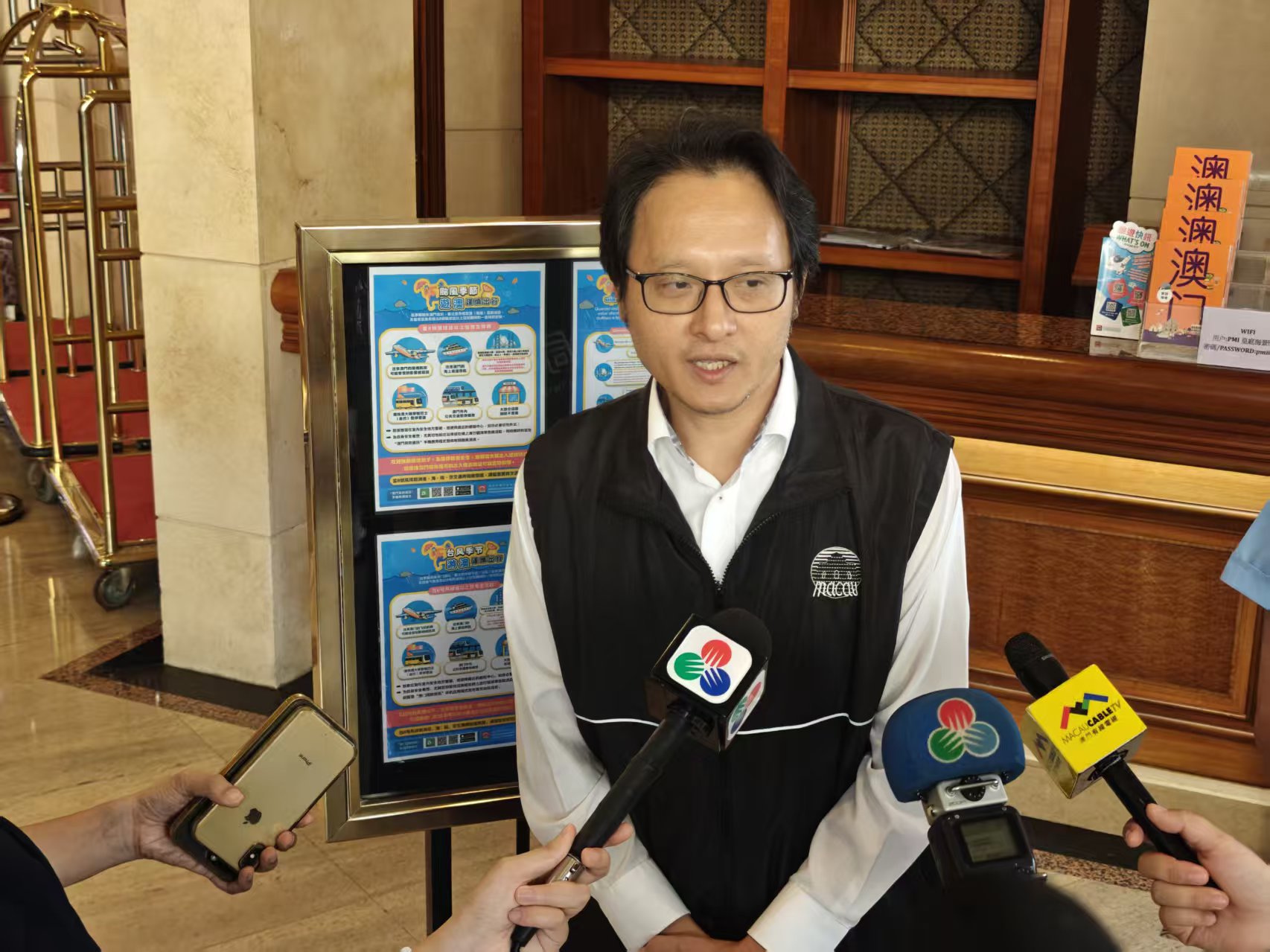 而為應對颱風天氣帶來的影響,旅遊局在颱風季節前與旅遊業界保持良好溝通,透過工作會議及發函提醒業界制定預案及做好各項準備工作,協調業界在颱風期間於酒店大堂顯眼位置展示颱風訊息,並協助向旅客發放臨時交通安排的資訊。與此同時,旅遊局於颱風期間會透過電訊公司向旅客發放民防訊息,旅遊熱線亦會維持24小時運作。