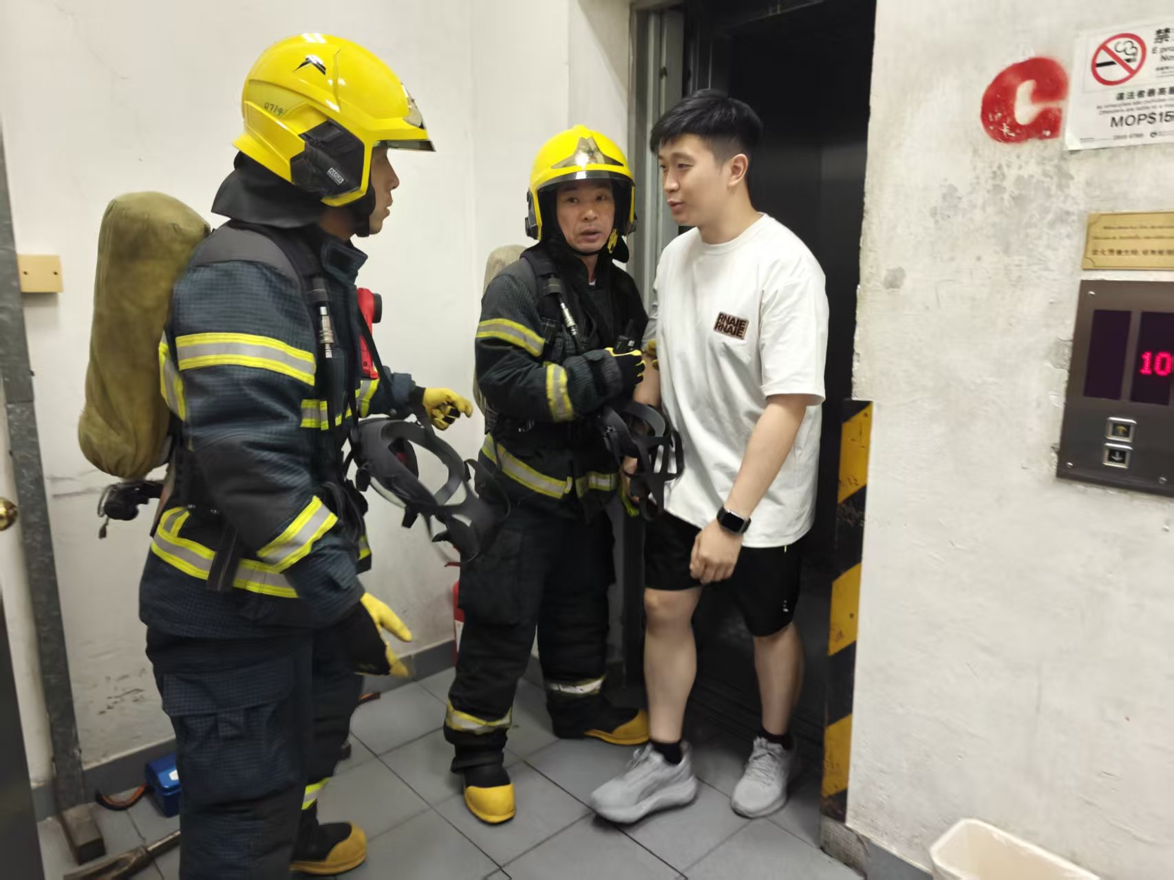 消防局出動4輛消防拯救車及2輛救護車以及28名隊員到場處理。消防員隨即展開滅火及救援工作。消防員將火勢撲滅,並利用工具(升降機專用鎖匙)將被困升降機內的1名男性住客救出,被困男子沒有受傷。完成排煙,並對酒店所有房間進行排查工作,確認現場環境安全及沒有其他傷者。