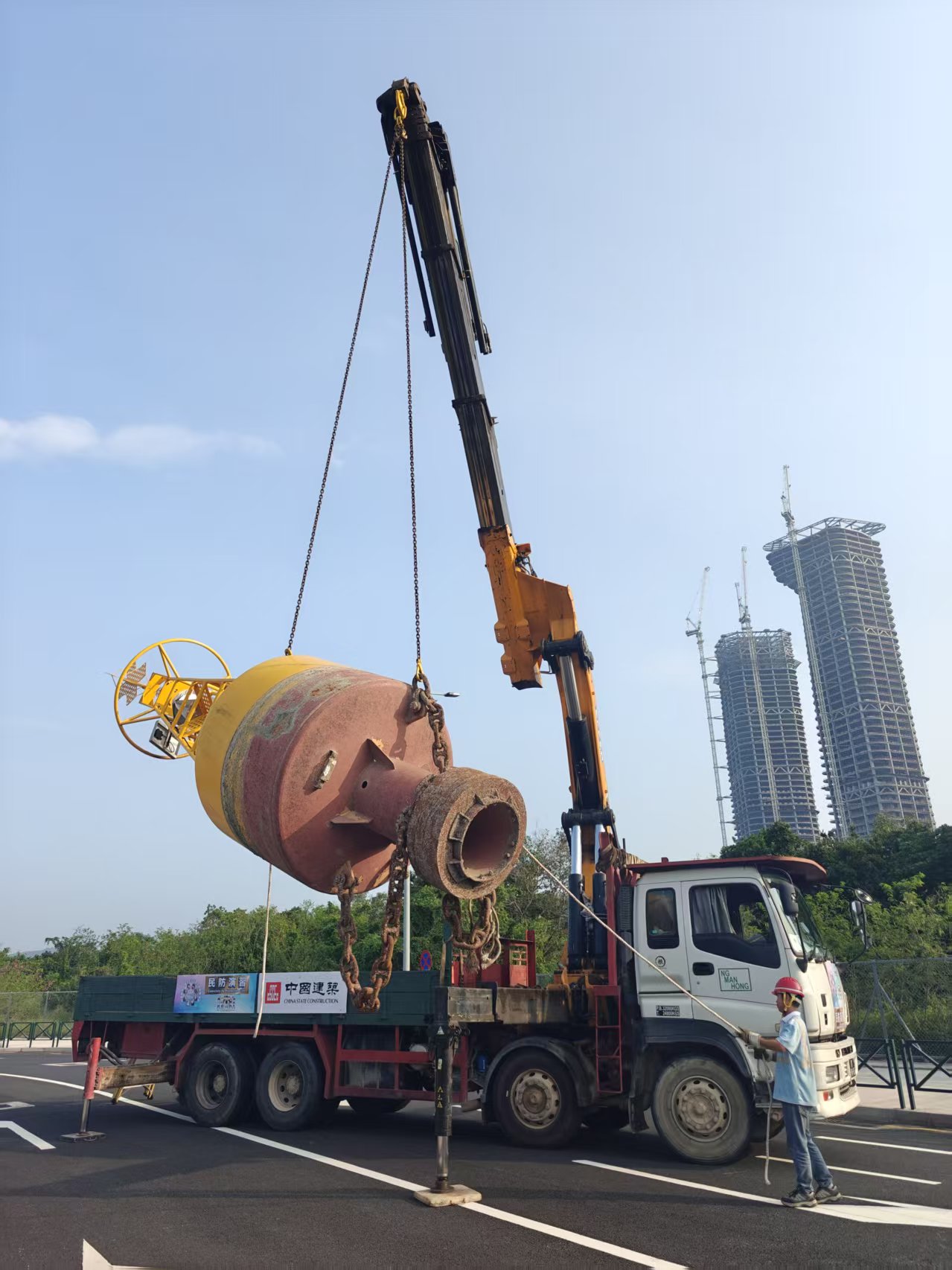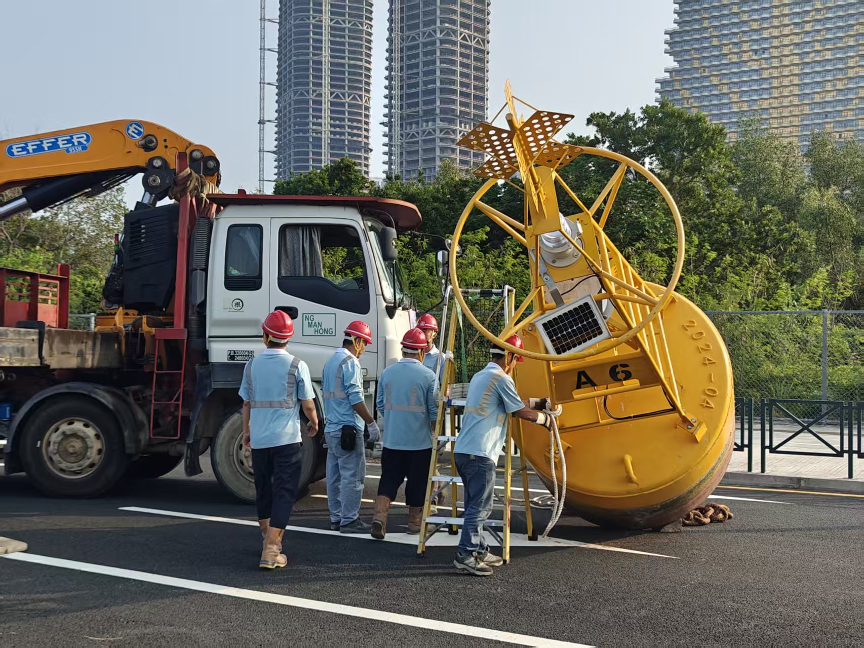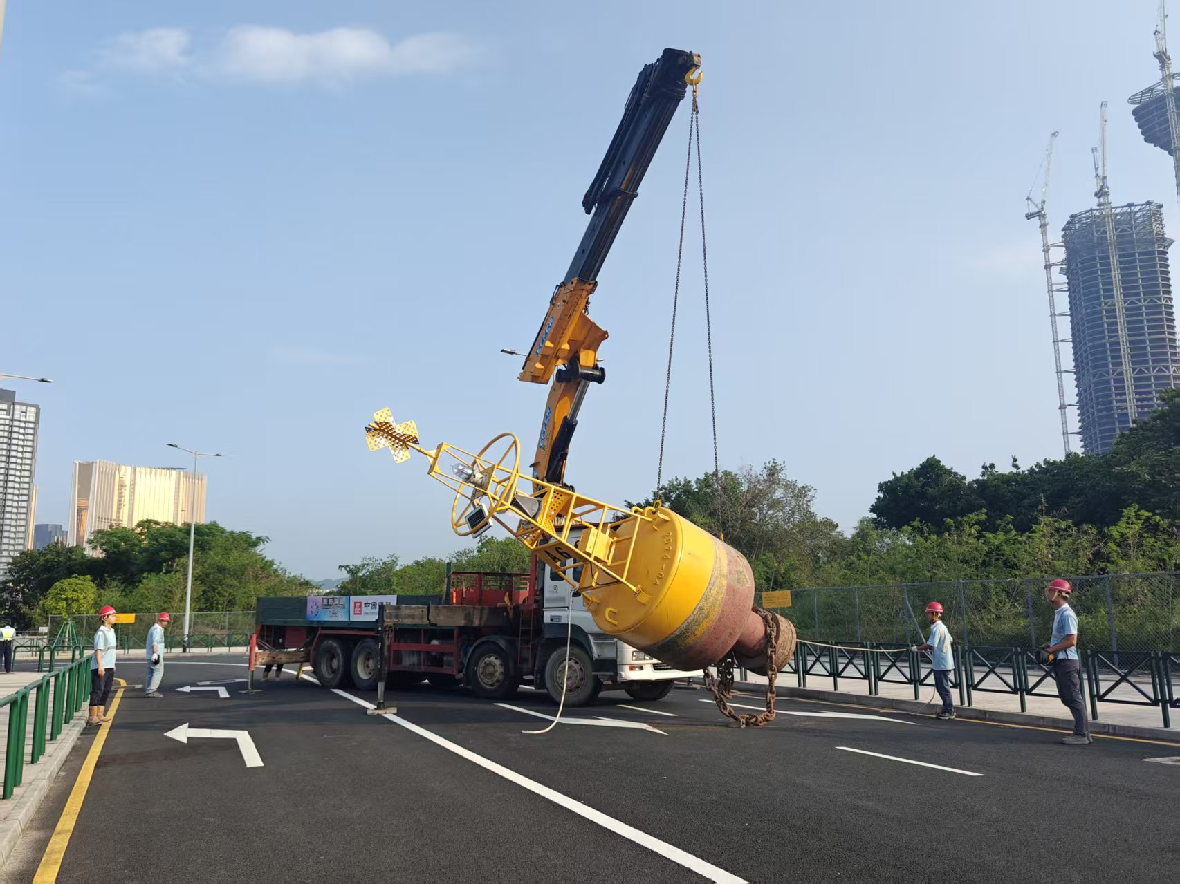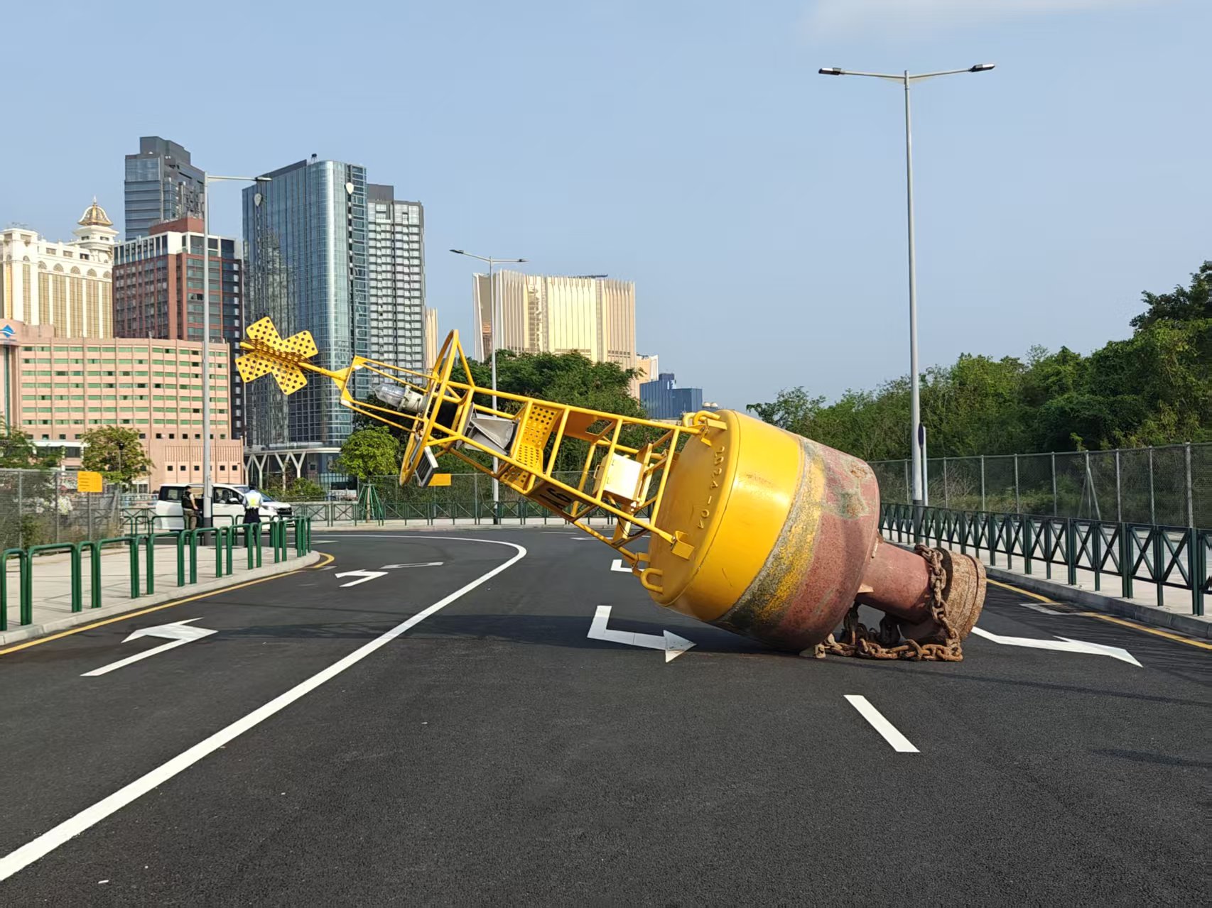 經民防行動中心綜合評估,決定聯絡中國建築工程(澳門)有限公司尋求協助。經治安警協調後,交通警員帶領中國建築大型吊車到場,由吊車將相關大型浮標及被壓毁的汽車吊離現場,事件處理完成後,解封相關路段,交通恢復正常。
