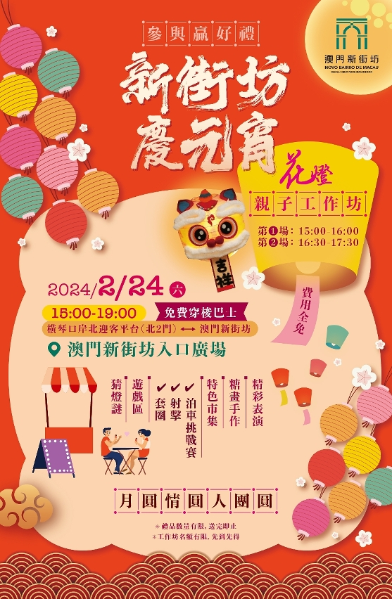 【即時新聞】為與澳門市民一同感受琴澳濃厚節日氣氛,澳門都市更新股份有限公司將於2月24日(周六)下午三時至晚上七時在橫琴「澳門新街坊」首次舉行「新街坊‧慶元宵」活動,現場設有多項遊戲攤位、「花燈製作親子工作坊」及特色市集,屆時社區將充滿人氣、煙火氣,歡迎市民到場「打卡」,與街坊分享佳節喜悅。