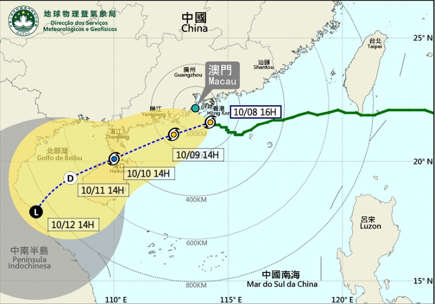 【特訊】八號東北風球於下午4時30分發出。預料八號風球將在晚間維持。預測本澳風力將會增強。在下午4時颱風 “小犬”集結在本澳東南約90公里。
