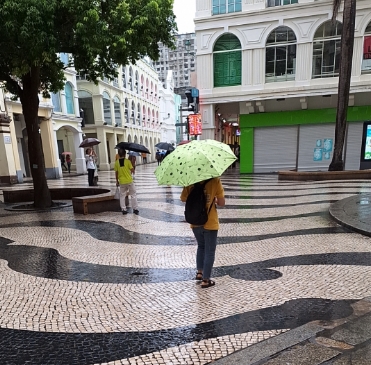 在下午,本澳中區多間商店已關門暫停營業,加上下雨,議事亭前地行人稀疏。內港低窪區域,部份商鋪及住宅大樓已裝好防水閘戒備。