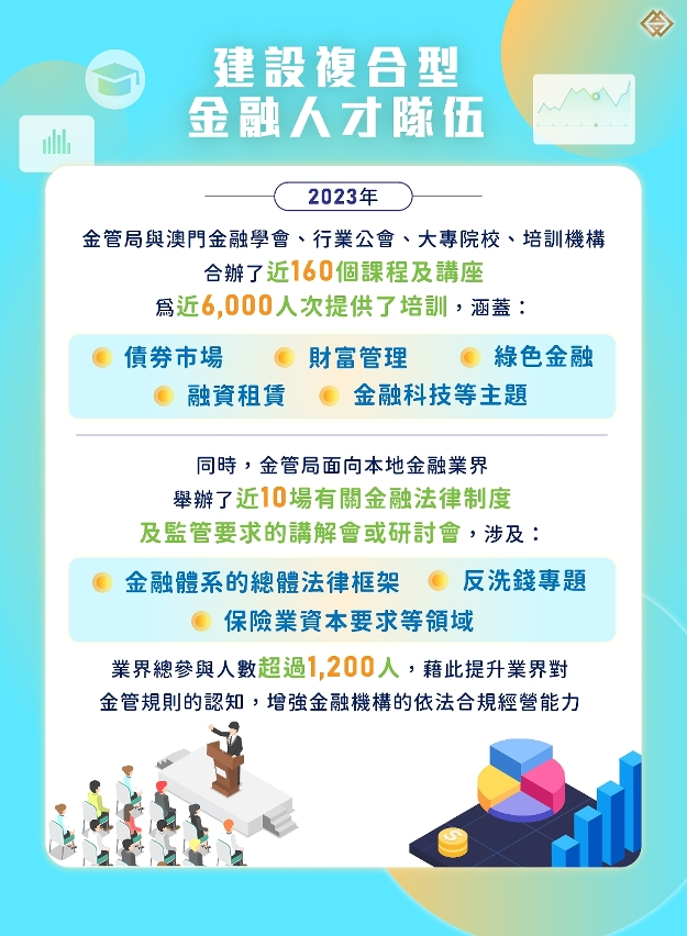 “金融知識基礎培訓系列課程”由金管局聯同澳門金融學會、本地行業公會和協會於2023年首次推出,逾400人次參加。金管局期望透過結合業界資源於2024年續辦系列課程,提升年青一代的整體專業實務知識和素質,以逐步建立金融業發展所需的青年人才梯隊,滿足現代金融業對人力資源的需求。
