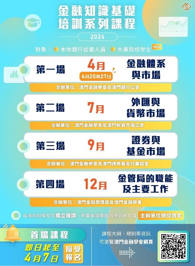 首場課程將於2024年4月20、27日(星期六)進行授課,由即日起至4月7日接受報名。課程內容及報名詳情可瀏覽澳門金融學會網頁( https://ifs.org.mo/Document/Courses/IFS-2024-31.pd... )。其餘三場課程的報名資訊將於稍後由澳門金融學會公佈,有興趣的人士請留意學會網頁的最新消息。