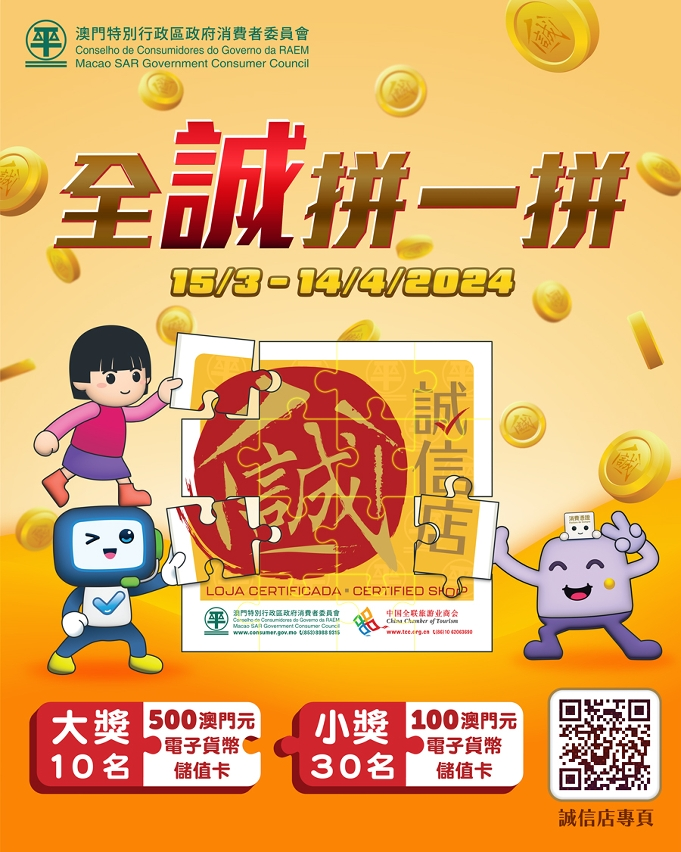 由3月15日起,消委會舉辦為期一個月的“全誠拼一拼”活動,活動設10名大獎及30名小獎,獎品分別為內附500澳門元及100澳門元的“誠信店”特別版電子貨幣儲值卡乙張,凡於該活動結束前年滿3歲,持有效澳門居民身份證的人士均具資格參加該網上拼圖遊戲。“全誠拼一拼”活動章程於同日上載到消委會網頁( https://www.consumer.gov.mo ),歡迎居民踴躍參加。