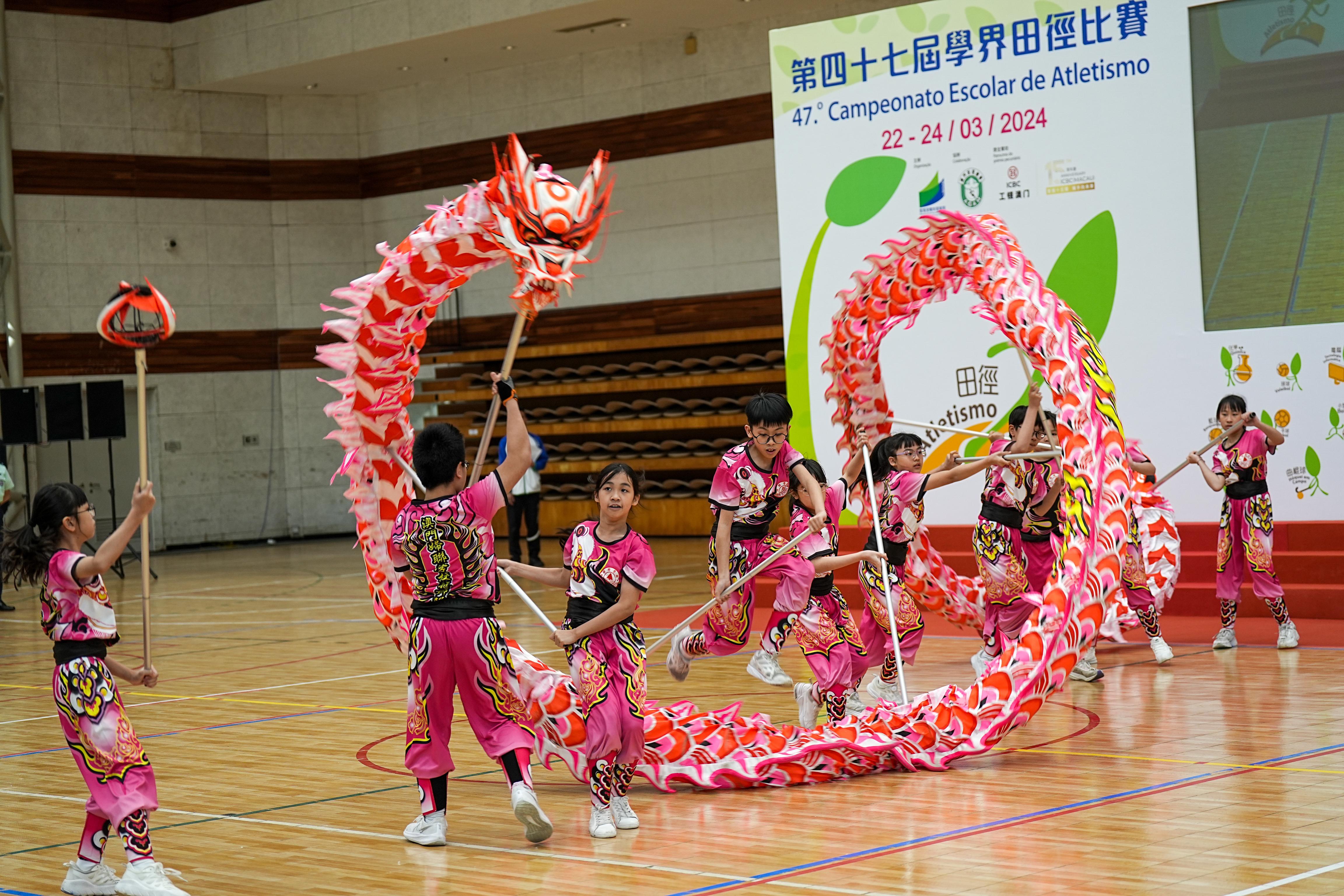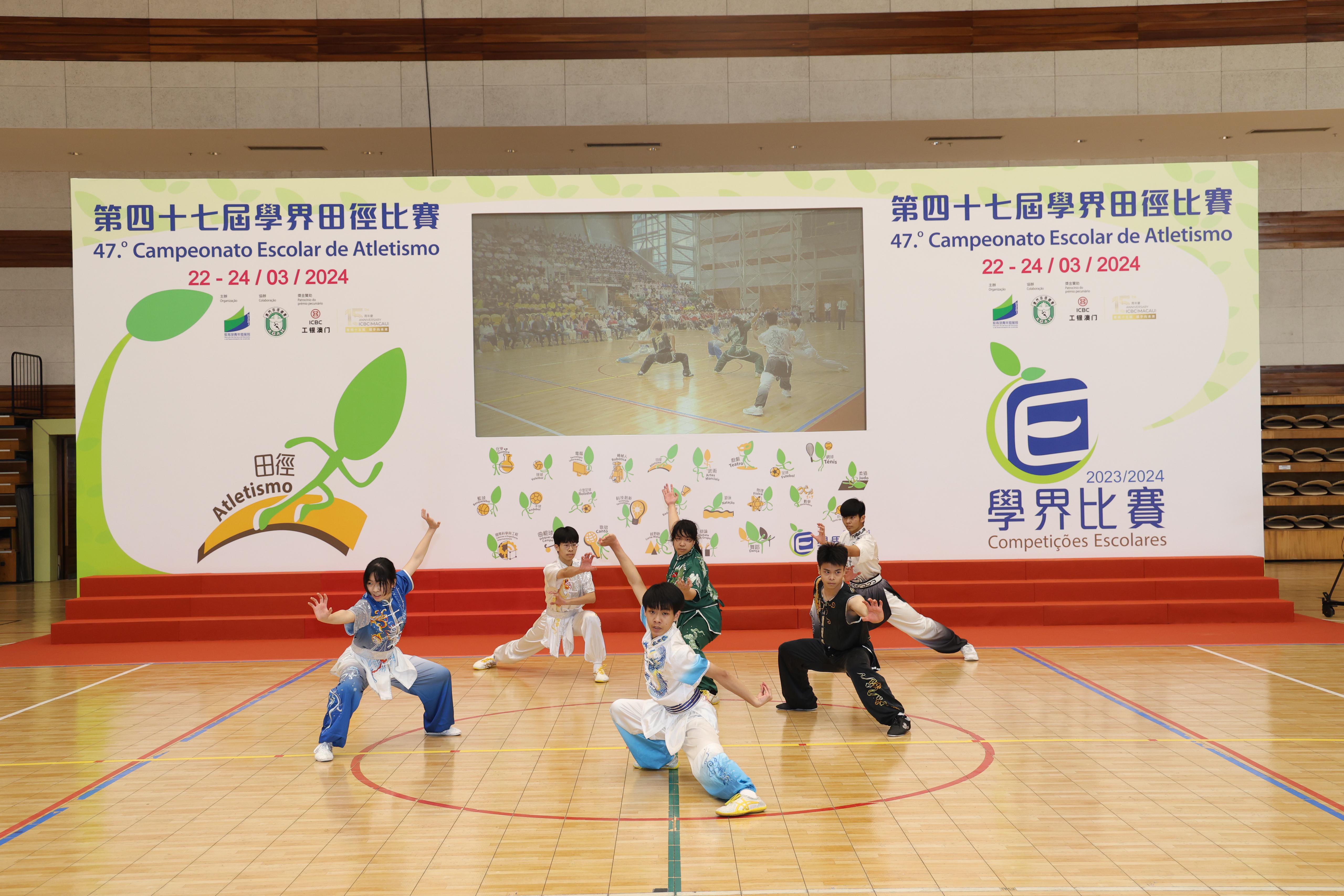 適逢2024年是中華人民共和國成立75周年及澳門回歸祖國25周年,教青局特別邀請澳門武術總會協助組織學生進行兩項武術表演,包括在今年2月葡萄牙 “歡樂春節” 大受歡迎的 “武” 林集體拳術及個人武術項目,由來自聖公會(澳門)蔡高中學、勞校中學及菜農子弟學校的同學演出,以及多次在聯校五節龍擊鼓賽事中屢獲佳績的婦聯學校表演九節龍項目,共同弘揚中華文化,表達同學的愛國愛澳情懷。