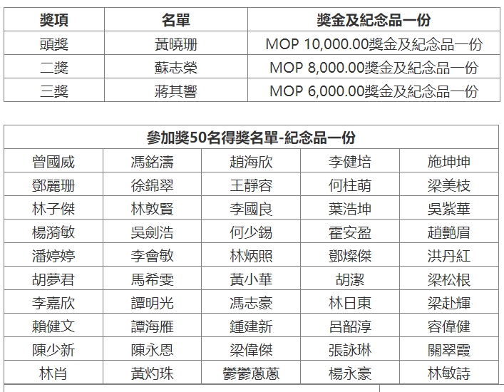 相關得獎名單如圖所列,公共建設局稍後將以電子郵件及簡訊通知得獎人士出席於四月十四日下午三時在澳門世界貿易中心五樓蓮花廳舉行的頒獎儀式。
