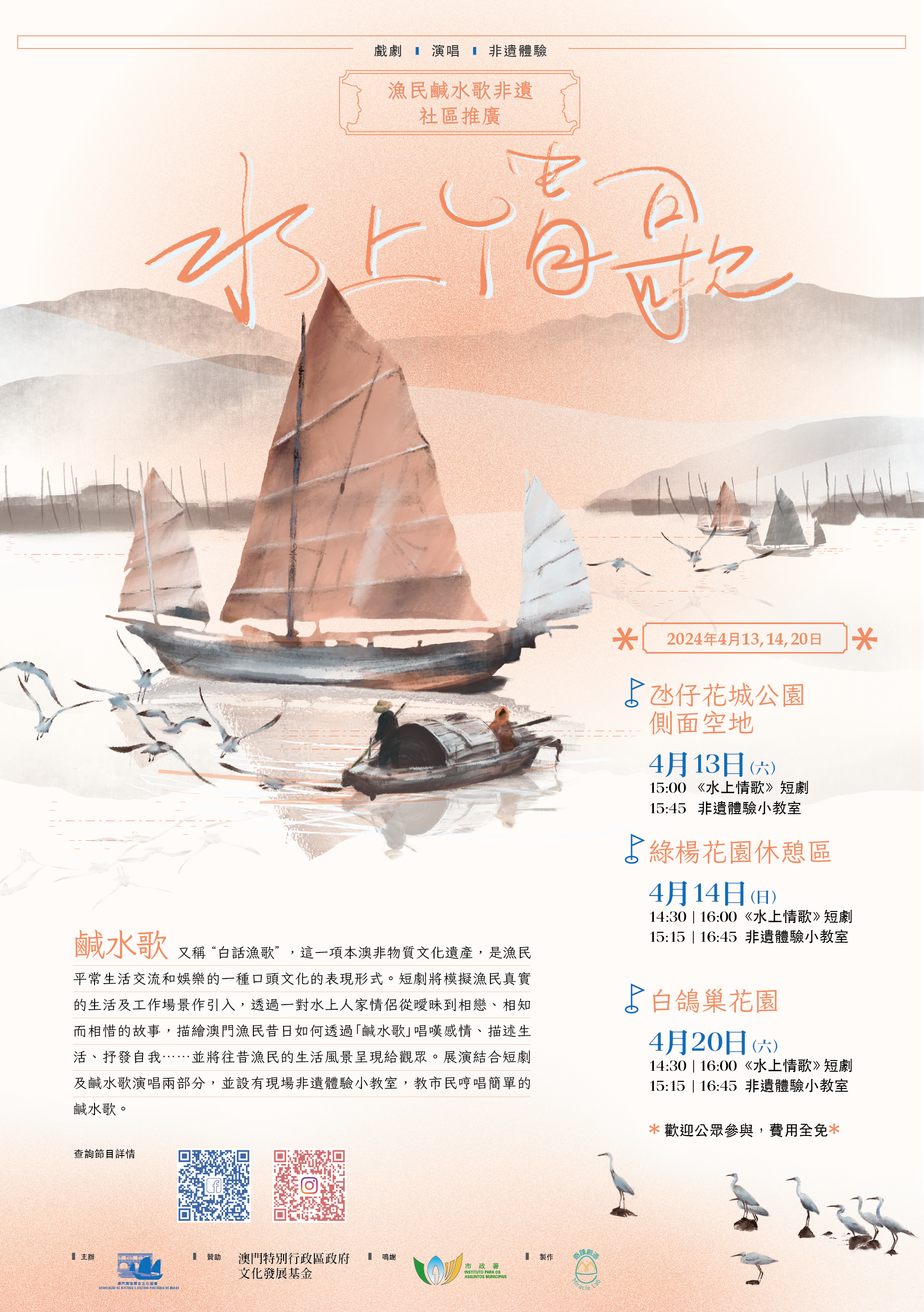 是次活動獲澳門特別行政區政府文化發展基金資助,為澳門海港歷史文化協會繼去年《水上情歌》公演後,再豐富其內容,以澳門小漁村的發展為題材策劃的展演。節目將融合戲劇情節、鹹水歌演唱,及非遺體驗小教室,以一對漁民夫妻的相遇相惜、船上日常,唱嘆漁民生活與產業發展的喜與憂,將往昔漁民的生活風景呈現給觀眾,歡迎有興趣的市民前來欣賞。
