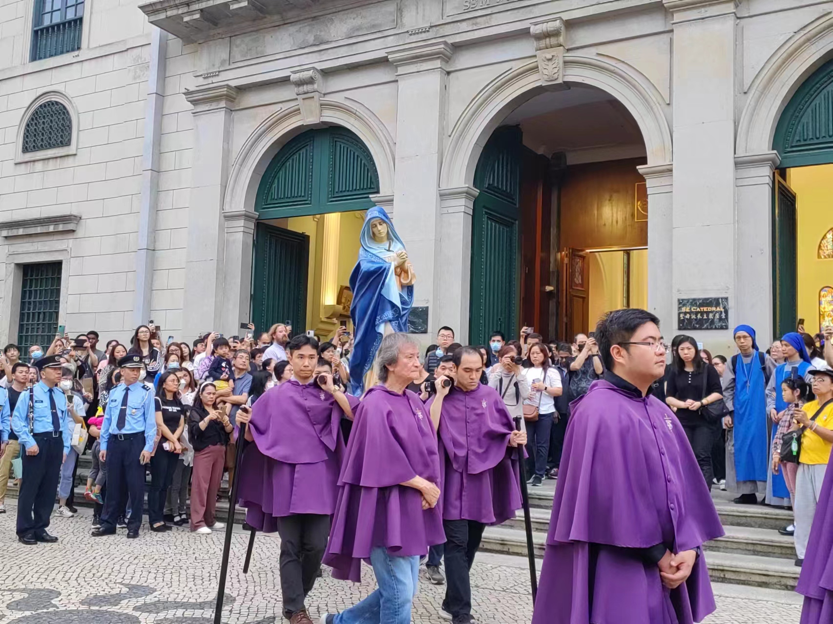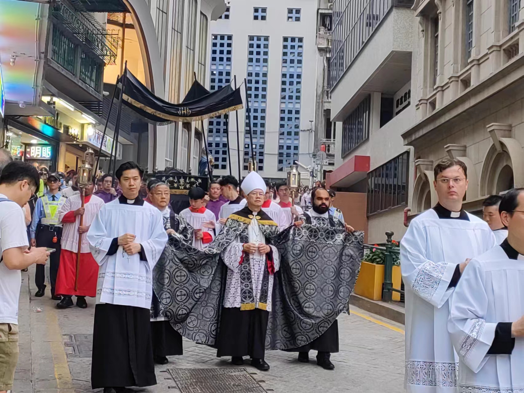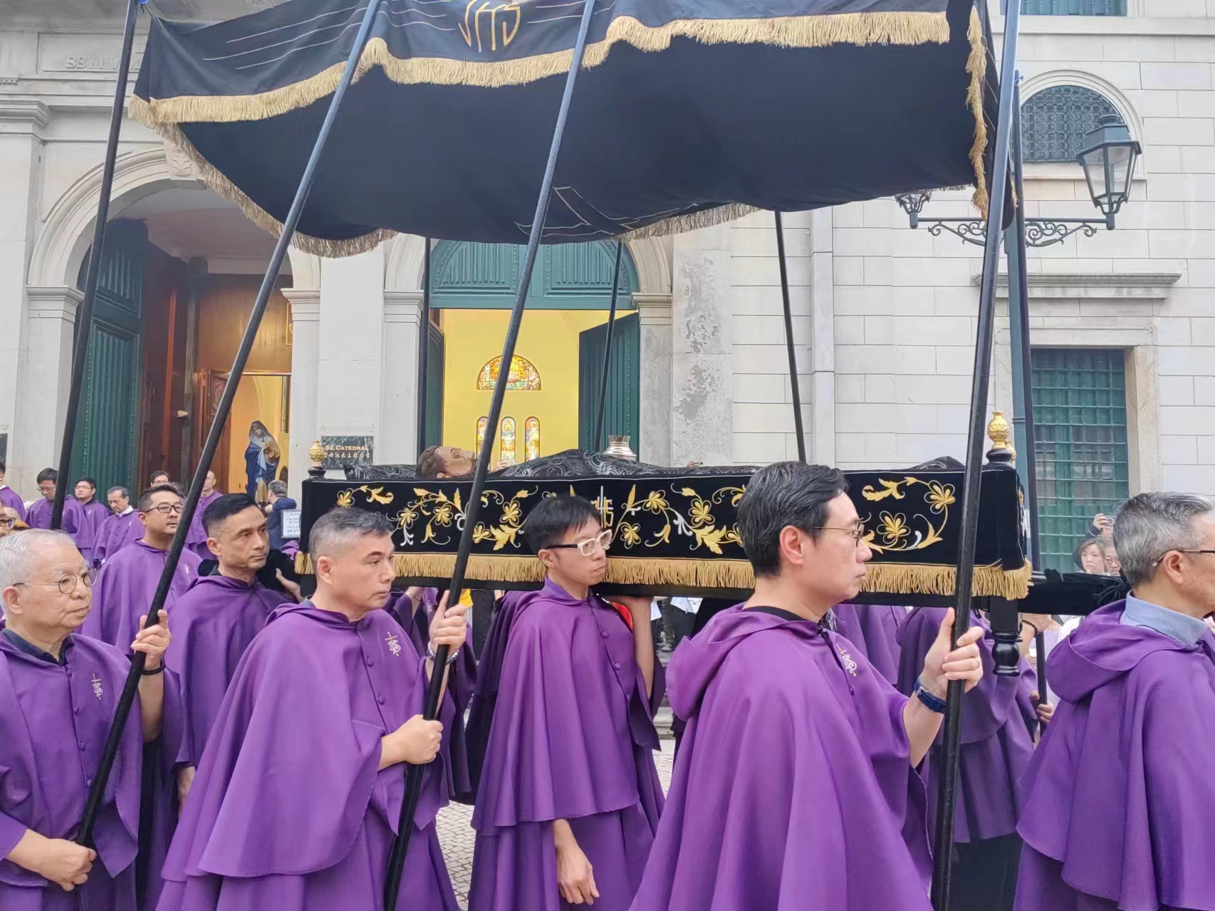 【即時新聞】今日是耶穌受難日,天主教澳門教區下午舉行「聖屍出遊」,巡遊路線由主教座堂出發,途經議事亭前地、玫瑰聖母堂、板樟堂街及主教巷等地,最後返回主教座堂,治安警銀樂隊沿途伴奏,活動吸引眾多市民遊客駐足觀看,沿途亦有警員在場維持秩序。