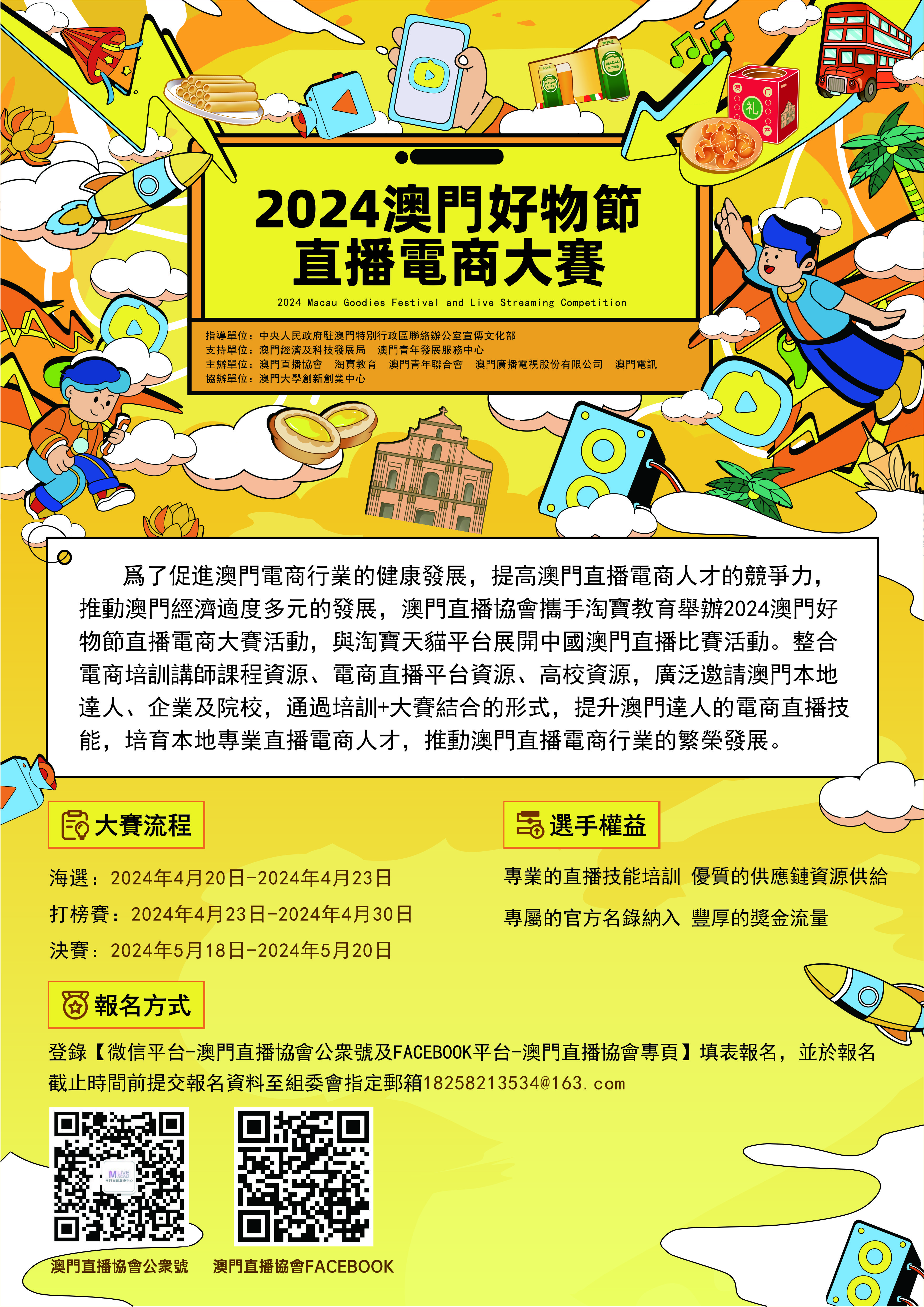 【即時新聞】由中聯辦宣傳文化部指導,經濟及科技發展局和澳門青年發展服務中心支持,澳門直播協會、淘寶教育、澳門青年聯合會、澳門廣播電視股份有限公司、澳門電訊主辦,澳門大學創新創業中心協辦的“2024澳門好物節直播電商大賽”已開始面向全澳市民招募,希望促進澳門電商行業的健康發展,提升澳門電商企業的競爭力,推動澳門經濟發展。
