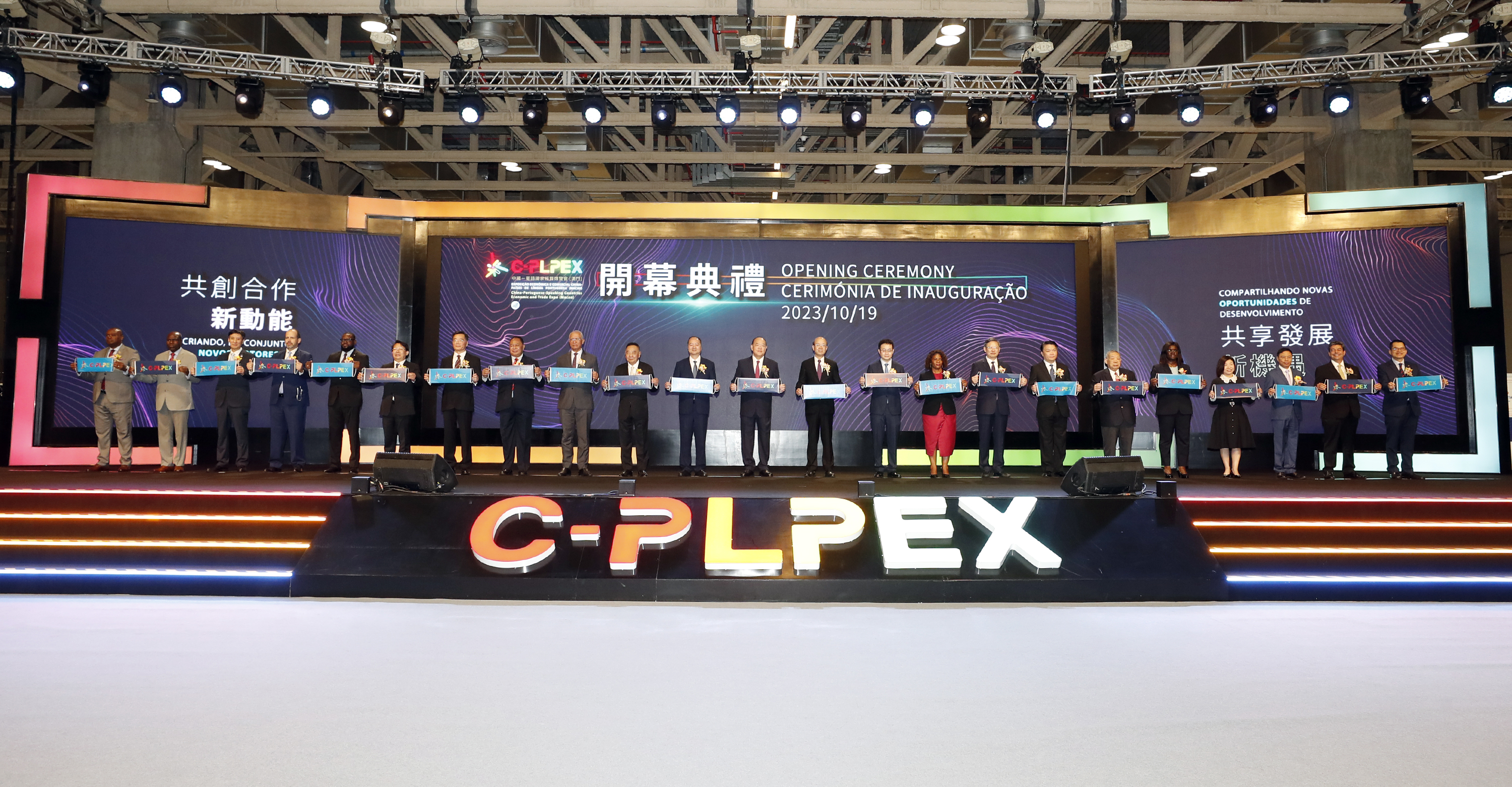 1.a C-PLPEX開幕式主禮嘉賓有行政長官賀一誠;中聯辦主任鄭新聰;外交公署特派員劉顯法;中國商務部前副部長陳健;中國商務部代表,台港澳司司長樊世杰;佛得角外交、合作與地區一體化部長Rui Alberto de Figueiredo Soares、聖多美和普林西比司法、公共行政和人權部長Ilza Maria dos Santos Amado Vaz;東帝汶外交與合作部長Bendito dos Santos Freitas;江蘇省人大常委會副主任周廣智;安徽省人大常委會副主任韓軍;澳門特別行政區政府經濟財政司司長李偉農;山東省人民政府代表,台港澳事務辦公室主任張連三;澳門特別行政區立法會副主席、澳門中華總商會會長崔世昌;赤道幾內亞貿易、工業和企業促進部副部長Jerónimo Carlos OSA OSA Nzang;幾內亞比紹計劃與區域一體化國務秘書Mussubá Canté;葡萄牙經濟國務秘書Pedro Miguel Ferreira Jorge Cilínio;澳門特別行政區政府經濟財政司司長辦公室主任辜美玲;中國國際貿易促進委員會任鴻斌會長代表崔文龍;中國—葡語國家 經貿合作論壇(澳門)常設秘書處秘書長季先峥;安哥拉外交部亞洲大洋洲司司長Miguel Dialamicua;巴西外交部中國、俄羅斯和中亞司司長Pedro Murilo Ortega Terra;莫桑比克工業和貿易部對外貿易司司長Claire Mateus Filipe Correia Zimba;澳門貿易投資促進局主席余雨生。
