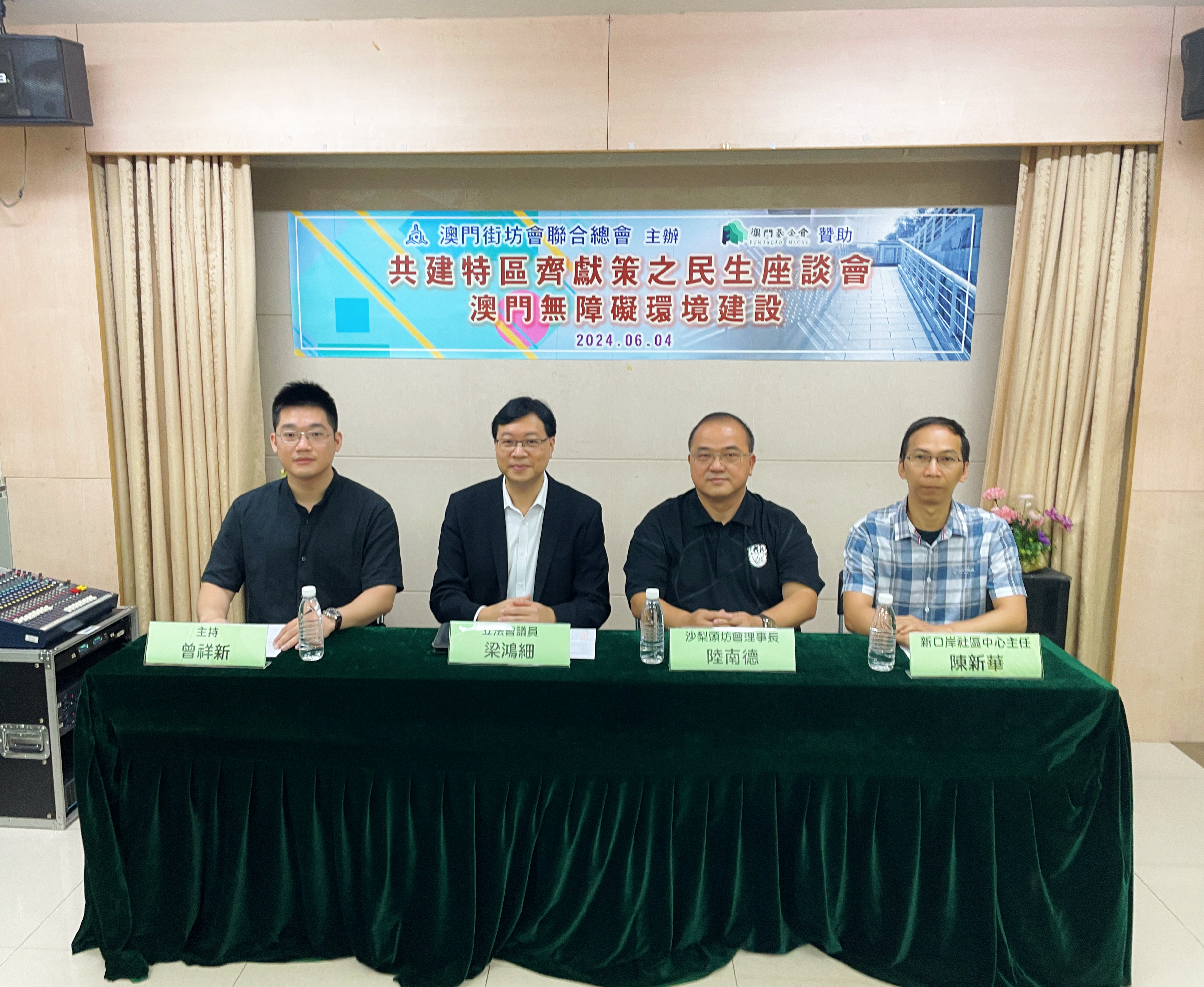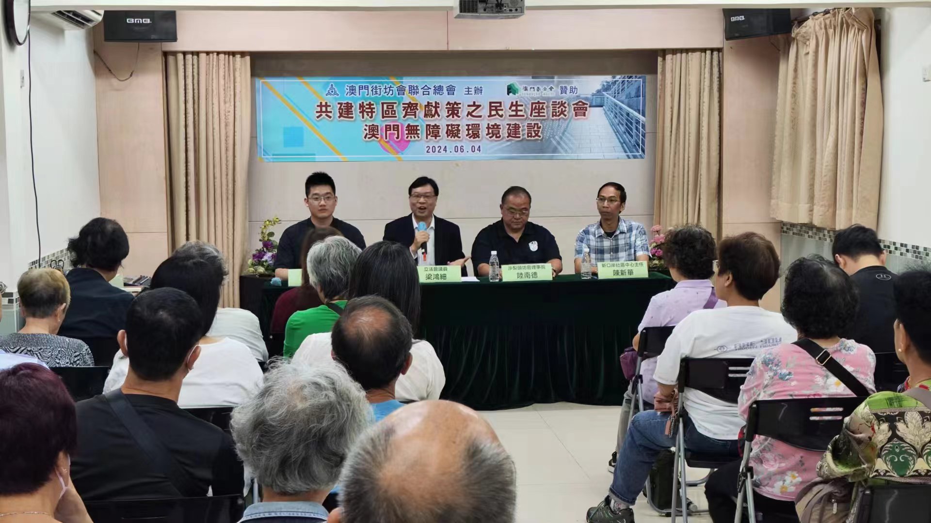 【即時新聞】街總今日上午舉行民生座談會,邀請議員梁鴻細,沙梨頭坊會理事長陸南德及新口岸社區中心主任陳新華就本澳無障礙環境建設進行探討。