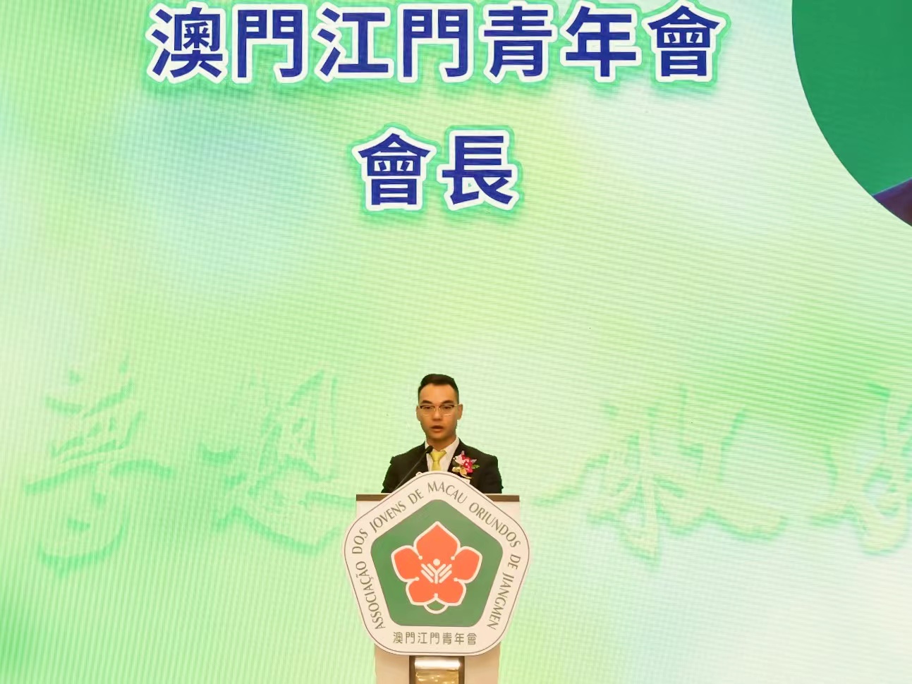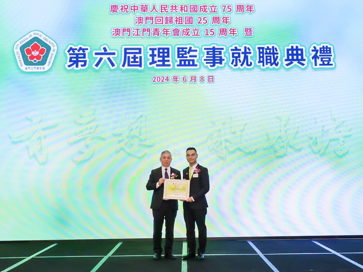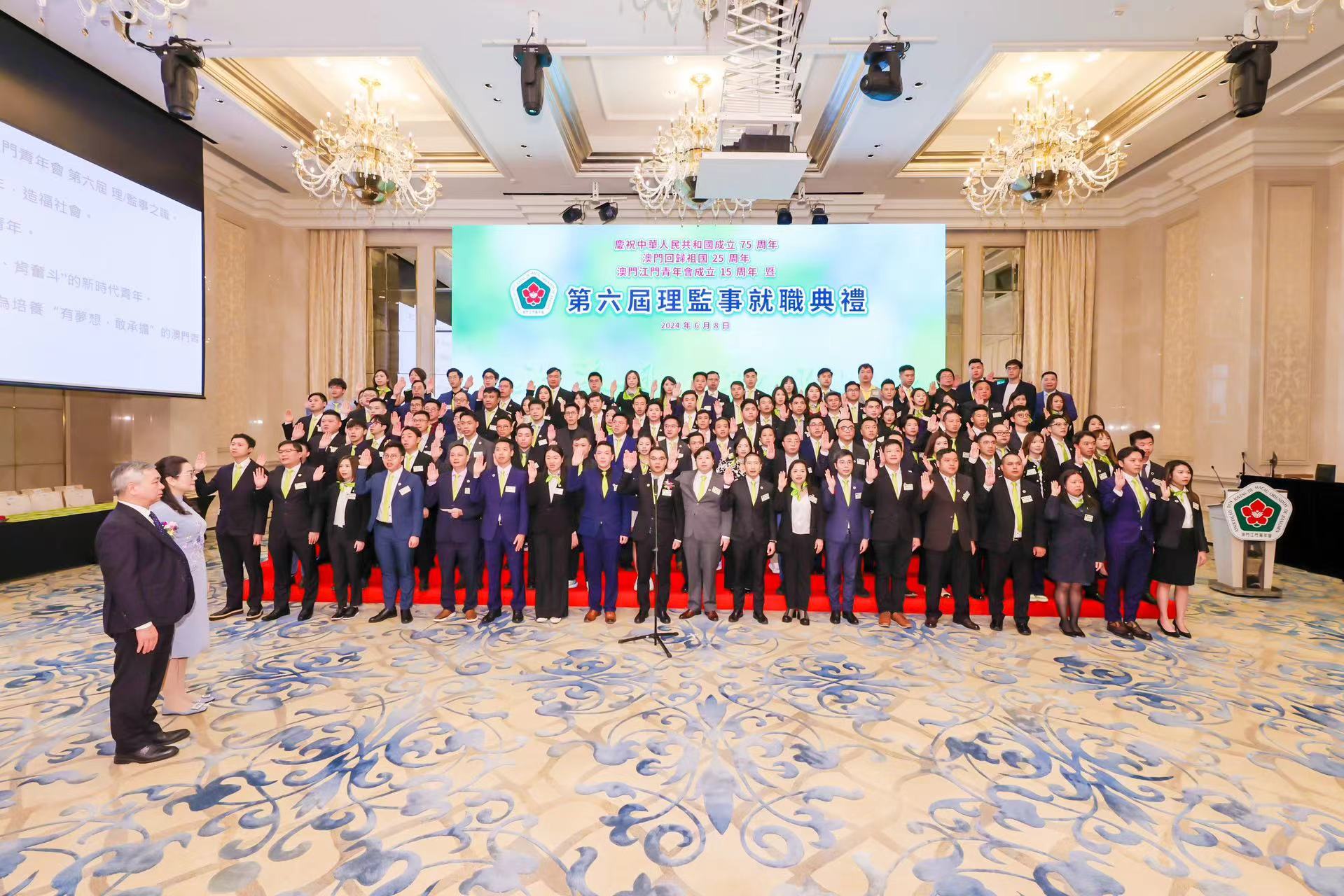 就職儀式下午3時假麗思卡爾頓酒店宴會廳舉行,在澳門江門同鄉會會長陳少清,江門市政協黨組成員、副主席湯惠紅監誓下,澳門江門青年會第六屆會長夏俊英帶領本屆理監事成員宣誓就職。