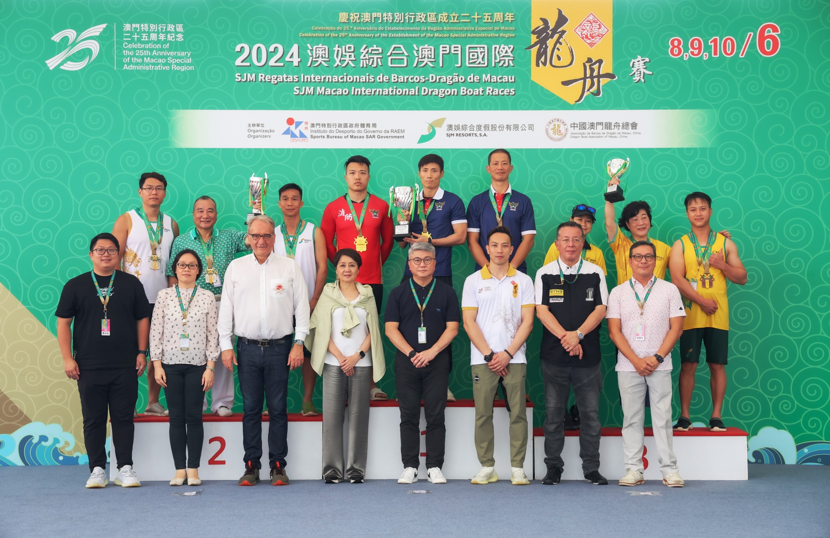 出席賽事的頒獎嘉賓有體育局局長潘永權、澳娛綜合度假股份有限公司董事梁安琪、中國澳門龍舟總會理事長黃家豪、國際龍舟聯合會主席克勞迪奧.舍米、市政署市政管理委員會主席戴祖義、行政公職局局長吳惠嫻、體育委員會委員張貴洪及趙文杜。