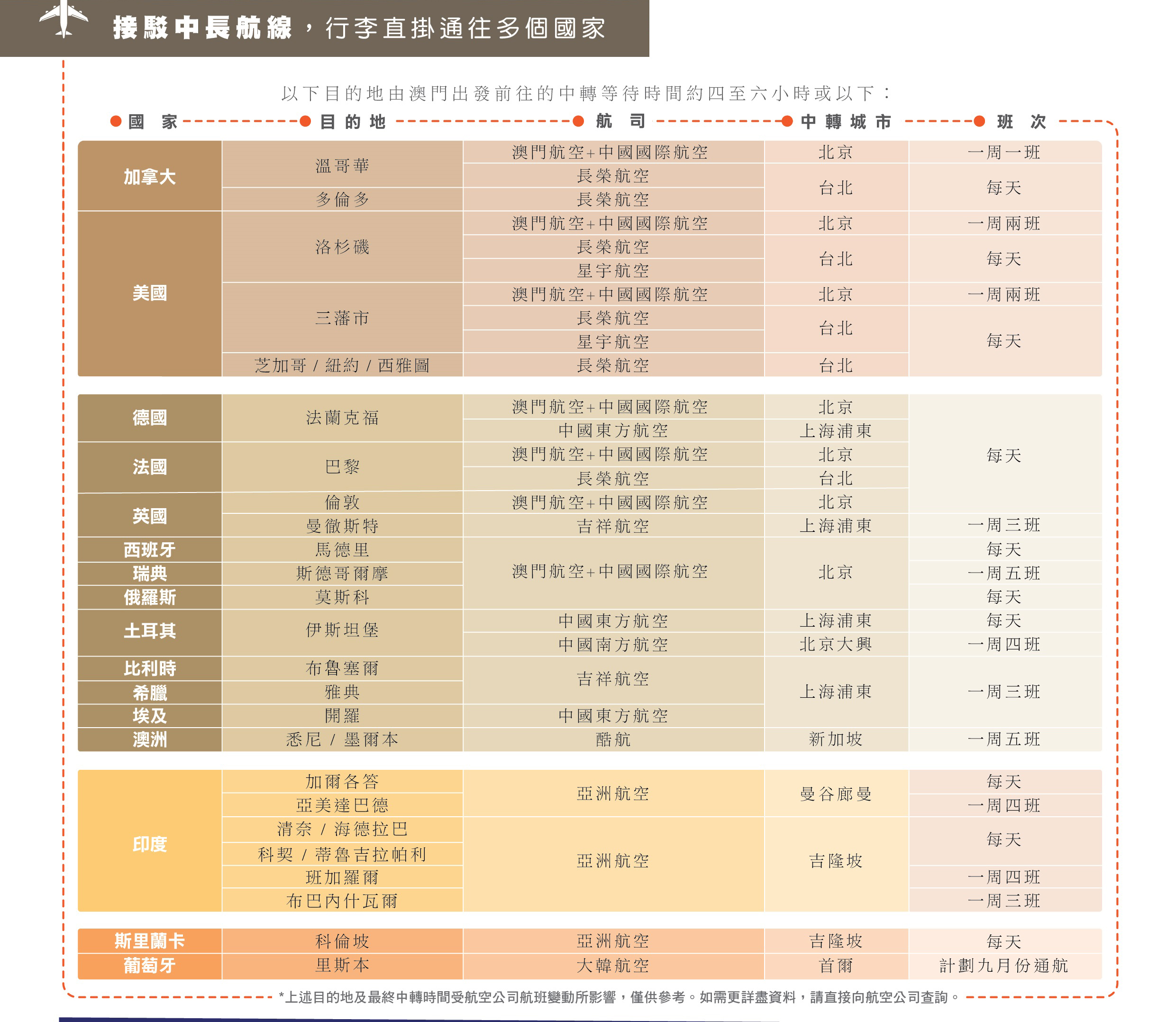 目前,澳門國際機場除了積極發展直航城市,機場亦積極發揮航空公司的國際航線網路,為旅客提供更多元化一站式的旅遊服務,現時由澳門出發中轉等待約四至六小時的目的地已有多個選擇,其中包括透過澳門航空、中國國際航空、長榮航空及星宇航空等中轉至加拿大、美國、俄羅斯及歐洲等多個主要城市;而中國東方航空、中國南方航空及吉祥航空除可中轉至德國、土耳其、英國、比利時及希臘的主要城市外,更可達至埃及開羅;另外,澳洲的一些主要城市則可透過酷航於新加坡中轉前往;印度則可利用亞洲航空的航線網絡到達;大韓航空已落實2024年9月11日開通首爾到葡萄牙里斯本一周三班的航班,中轉時間約六小時,屆時旅客可乘搭大韓航空從澳門出發經韓國首爾到葡萄牙里斯本的一票到底行李直掛服務,進一步加強澳門作為中國與葡語系國家商貿合作服務平台的角色。