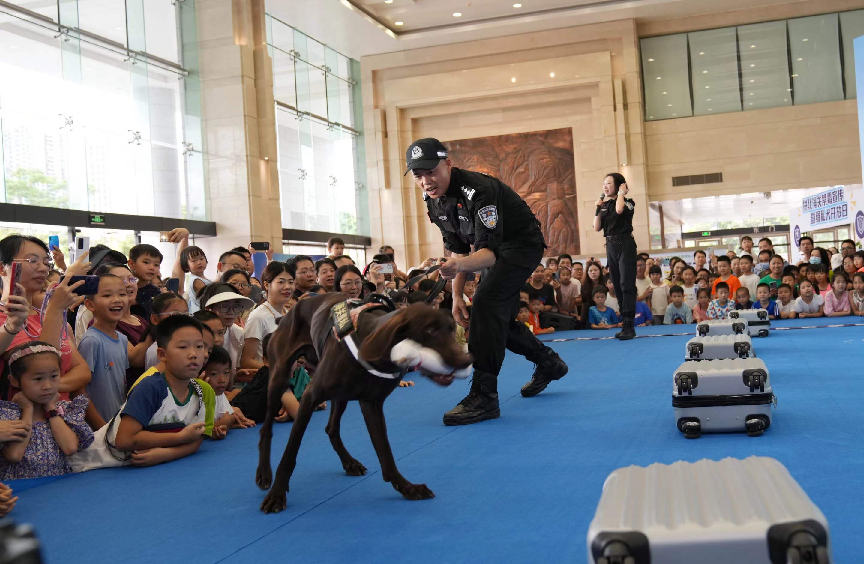 最為“吸睛”的環節還是緝私犬的現場搜毒表演。表演的主角——“毛毛”,訓練有素,憑著靈敏的嗅覺和過硬的本領,迅速從眾多行李箱中找到事先藏匿的毒品,穩穩地蹲坐在箱包旁邊,發出警示信號;另一主角——“蘭朵”,目光銳利,反應迅速,幾秒內就從多位配合表演的觀眾中把“藏毒分子”揪了出來。最後,只見壓軸主角——“金星”,在訓導員的帶領下,圍著一輛藏匿毒品的可疑車輛,對車輛的每個部位進行仔細搜索,很快就在車尾排氣管處找到了毒品,贏得了現場觀眾陣陣掌聲。
