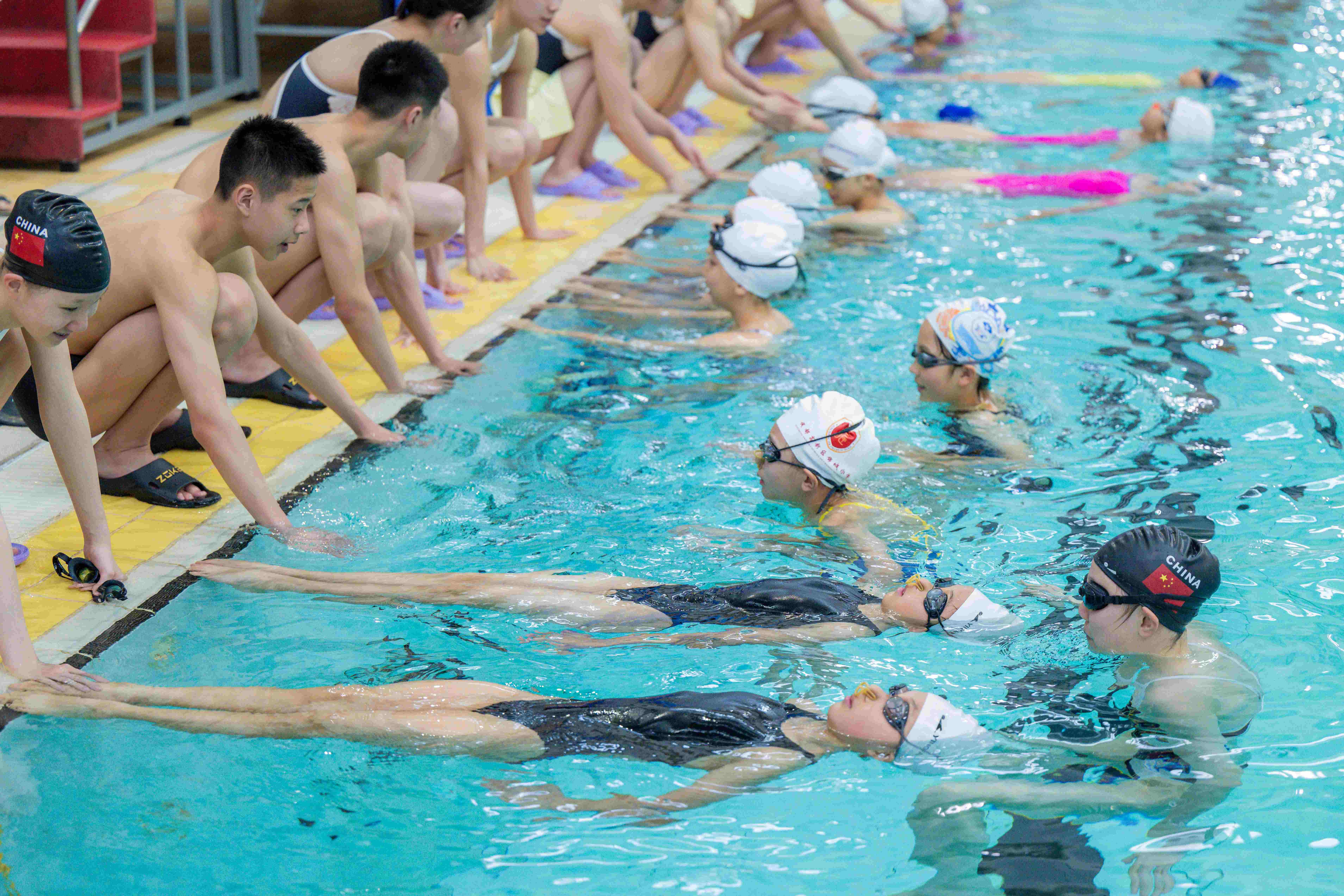 隨後開展的「藝術游泳大師班」技術交流環節,約60名來自不同省市的參賽青少年運動員隨機被分成三組,分別與三隊頂尖運動員探討表演動作技巧、表演風格、訓練方法等內容。頂尖運動員在分享心得後,更示範陸上動作和水中托舉動作,再指導參賽者實踐,從而提升他們的技術水平。