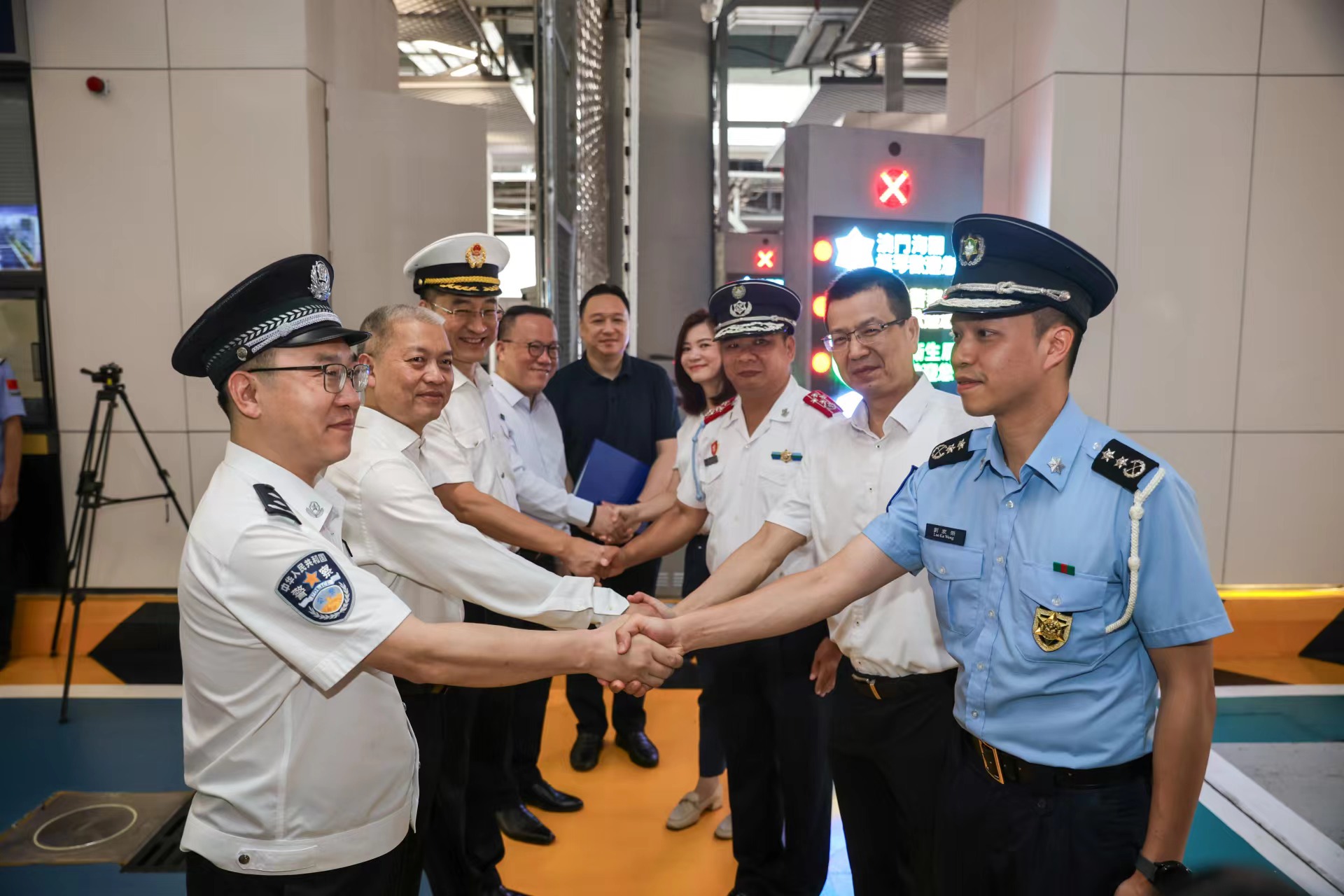 上午9時一過,隨著粵澳聯合一站式車道右前方電子屏上兩地5家聯檢單位名稱前的指示燈由紅色變為綠色,粵澳分界線上的防衝撞柱降落,道閘打開,一輛裝載著澳門物資的車輛經橫琴口岸通關進入橫琴合作區。