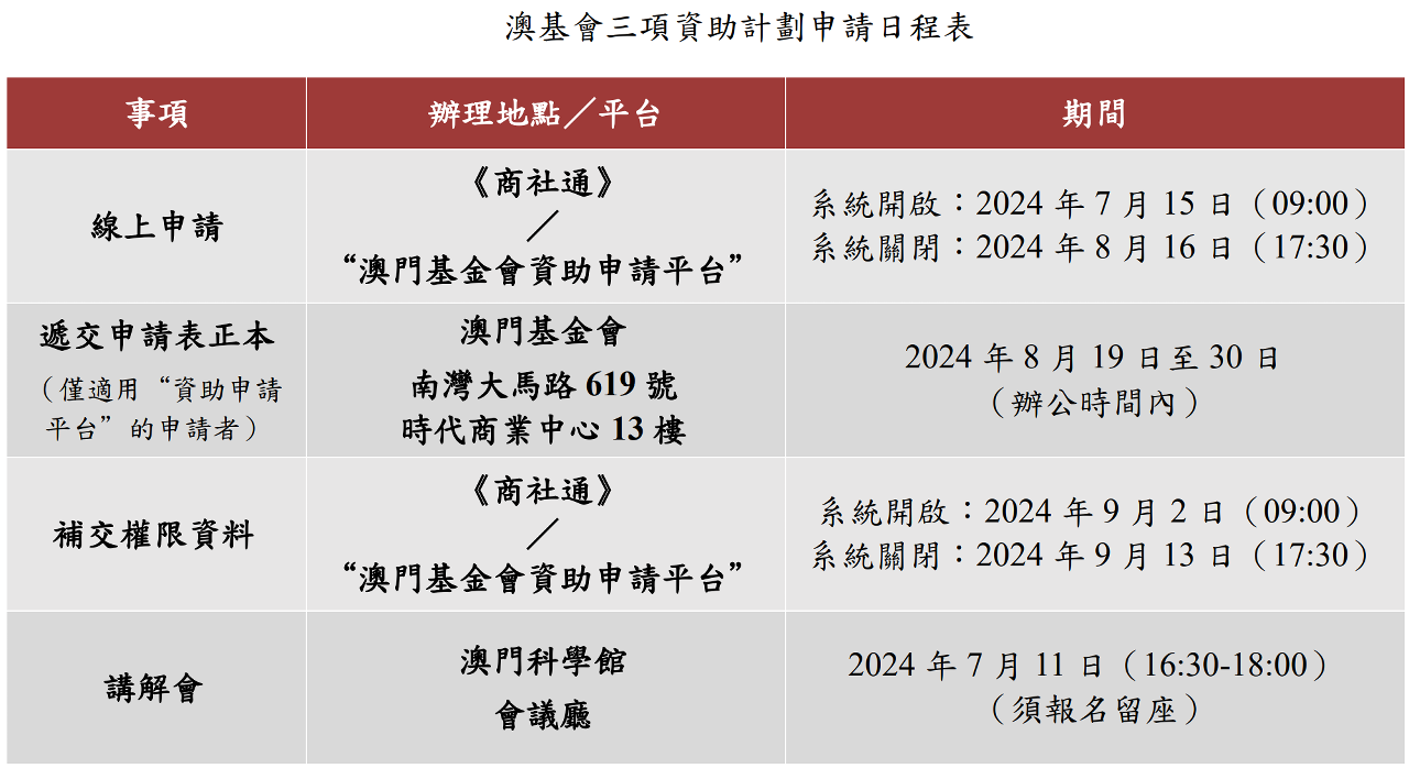 為確保公帑的合理使用,上述資助計劃以“擇優批給”為原則,以項目為主導,批給機制帶競爭性,強調社會效益、項目規劃和執行能力。符合資助要求或曾獲資助的項目並非必然獲得資助。澳基會提醒申請者,如實詳盡、認真細緻填寫申請表是申請資助的最基本要求,提交申請前須詳閱相關資助計劃章程,並留意日程安排,以及檢視社團領導架構的有效期限,以免因社團任期屆滿等原因影響申請的提交,逾期提交的申請將不受理。