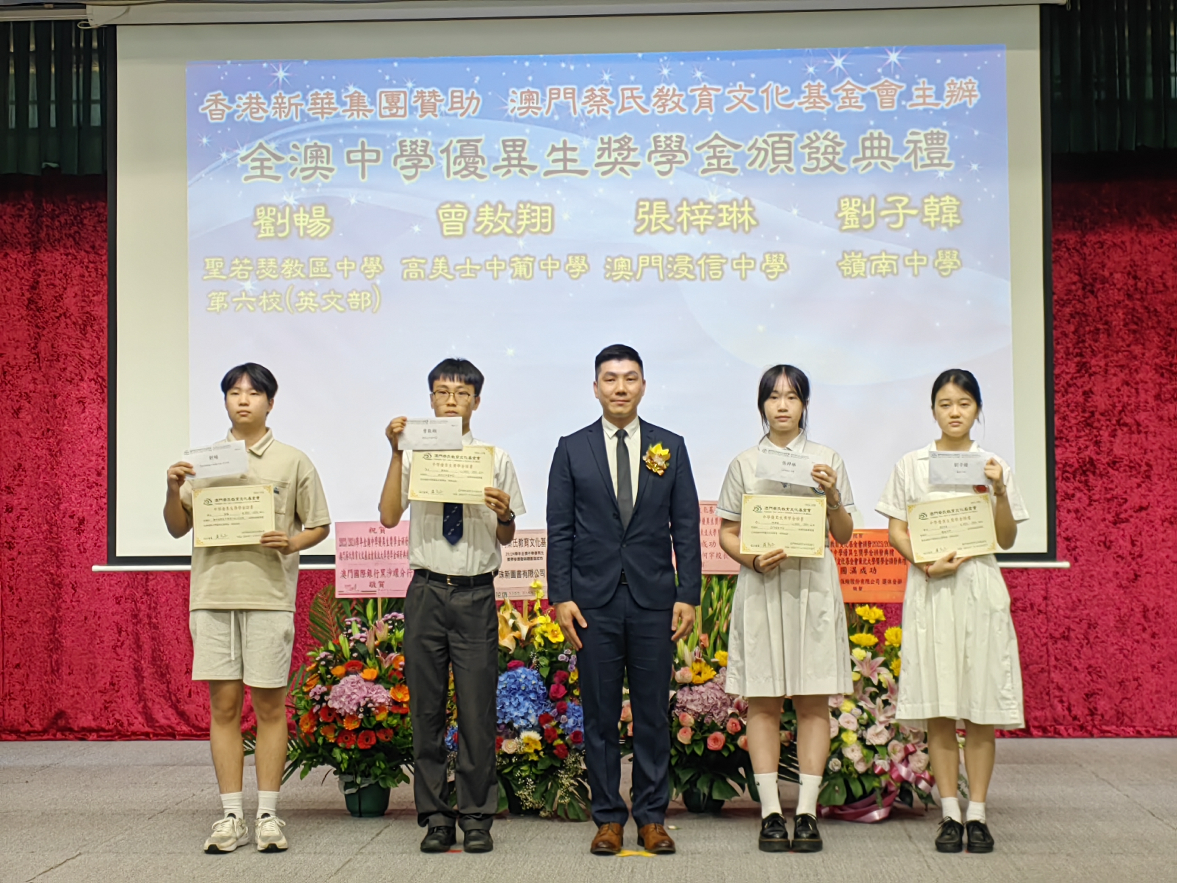 新華集團執行董事、澳門蔡氏教育文化基金會理事長蔡雋思表示,蔡氏教育文化基金會上世紀八十年代成立,一貫致力於推動澳門的教育和文化事業,得到社會各界和政府的大力支持;他祝賀所有獲獎的同學。千里之行,始於足下;勉勵同學們能夠珍惜今次殊榮,並以此為新的起點,繼續努力拼搏,追求更高更遠的目標,保持好奇心和求知慾,永不言棄,堅持不斷學習和進步,為國家和社會做出更大的貢獻。
