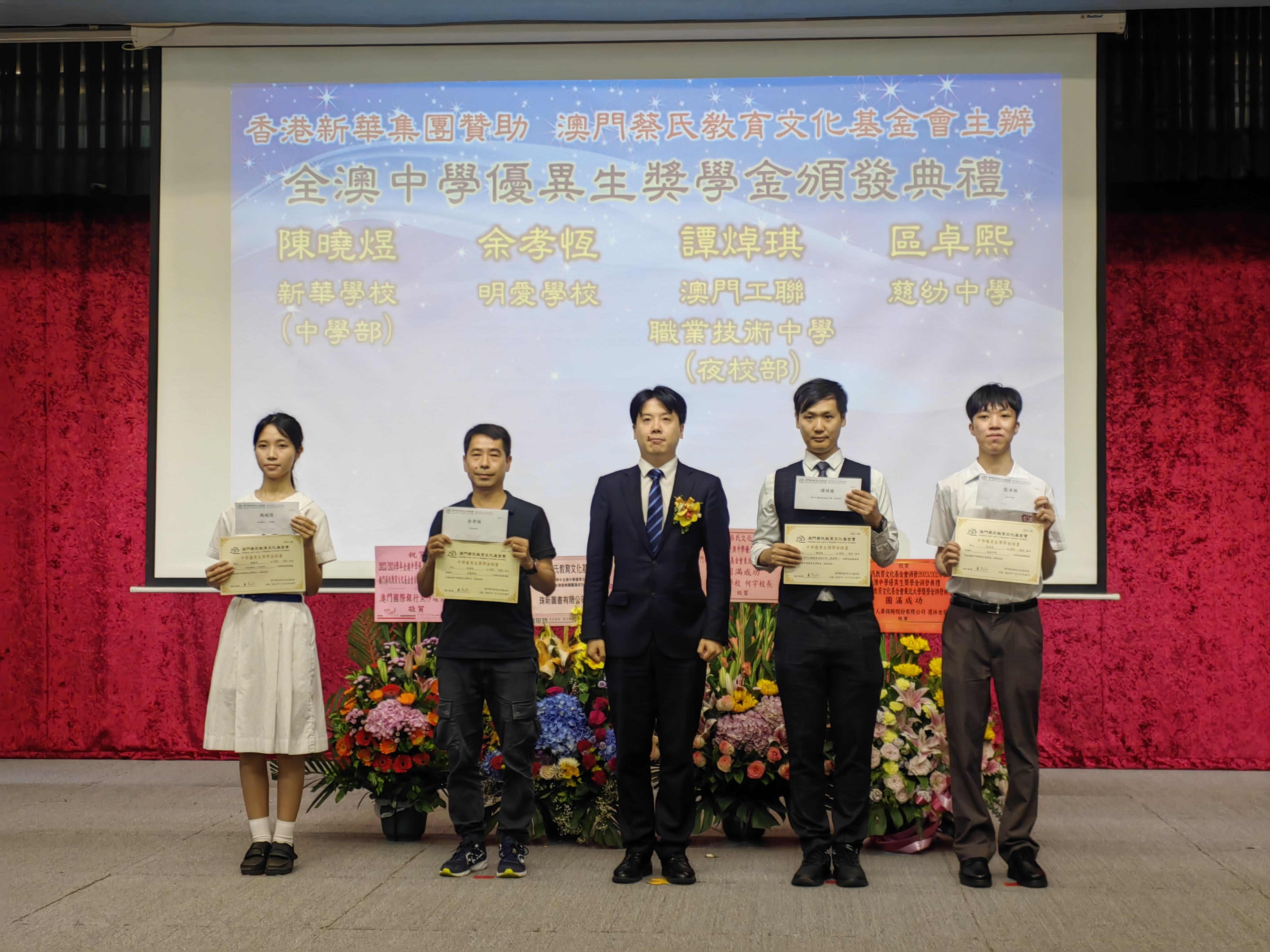 教育及青年發展局代處長陳澤賢致辭向所有獲獎的同學們表示誠致的祝賀。他稱,澳門蔡氏教育文化基金會多年來一直用最好的資源支持本澳學生學習,致力成就學生們的發展,獲得社會及各界人士的認同和支持。同時,更透過在本澳開辦新華學校和新華夜中學,為社會培育了無數傑出的學生,見證著學生的成長、成才、成功。澳門蔡氏教育文化基金會每年向本澳學習成績優異的中學生頒發獎學金,不但能夠鼓勵獲奬的同學們繼續努力學習,亦能夠讓獲奬的同學成為其他同學們學習的典範,帶動同學們一同學習,努力向上,提升整體的學習氛圍。
