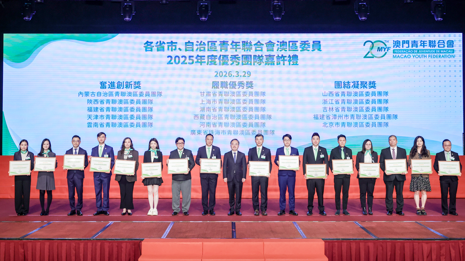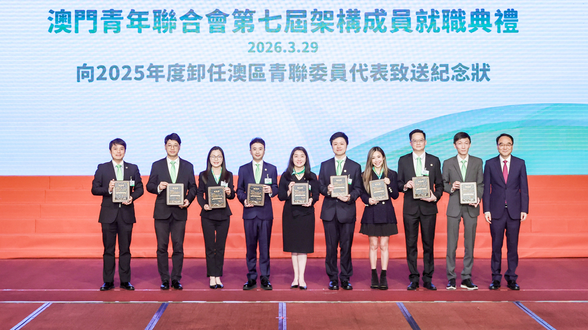 典禮上,在高開賢監誓下,第七屆架構成員宣誓就職。同場嘉許2025年度澳區青聯委員團隊,李迪為獲獎團隊頒獎並作出勉勵。其中「履職優秀獎」由甘肅省、上海市、湖南省、西藏自治區、河南省及廣東省珠海市青聯澳區委員團隊獲得;「奮進創新獎」由內蒙古自治區、陝西省、福建省、天津市及雲南省青聯澳區委員團隊獲得;「團結凝聚獎」由山西省、浙江省、吉林省、福建省漳州市、北京市青聯澳區委員團隊獲得。隨後,李雪飛向9位卸任委員頒發紀念狀,感謝他們對青年工作的無私奉獻。