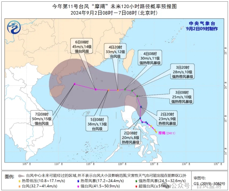 預計,“摩羯”將以每小時15-20公里的速度向偏北方向移動,3日開始轉向西偏北方向移動,並將於4日白天進入南海北部海面,後向華南一帶沿海靠近,強度逐漸加強,最強可達強颱風級或超強颱風級(45-52米/秒,14-16級)。